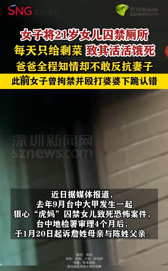 蛙岛女子将21岁女儿囚禁厕所每天只给剩菜致其活活饿死,爸爸全程知情却不敢反抗妻子。传言女子虐待自己女儿是因为女儿长相酷似婆婆...