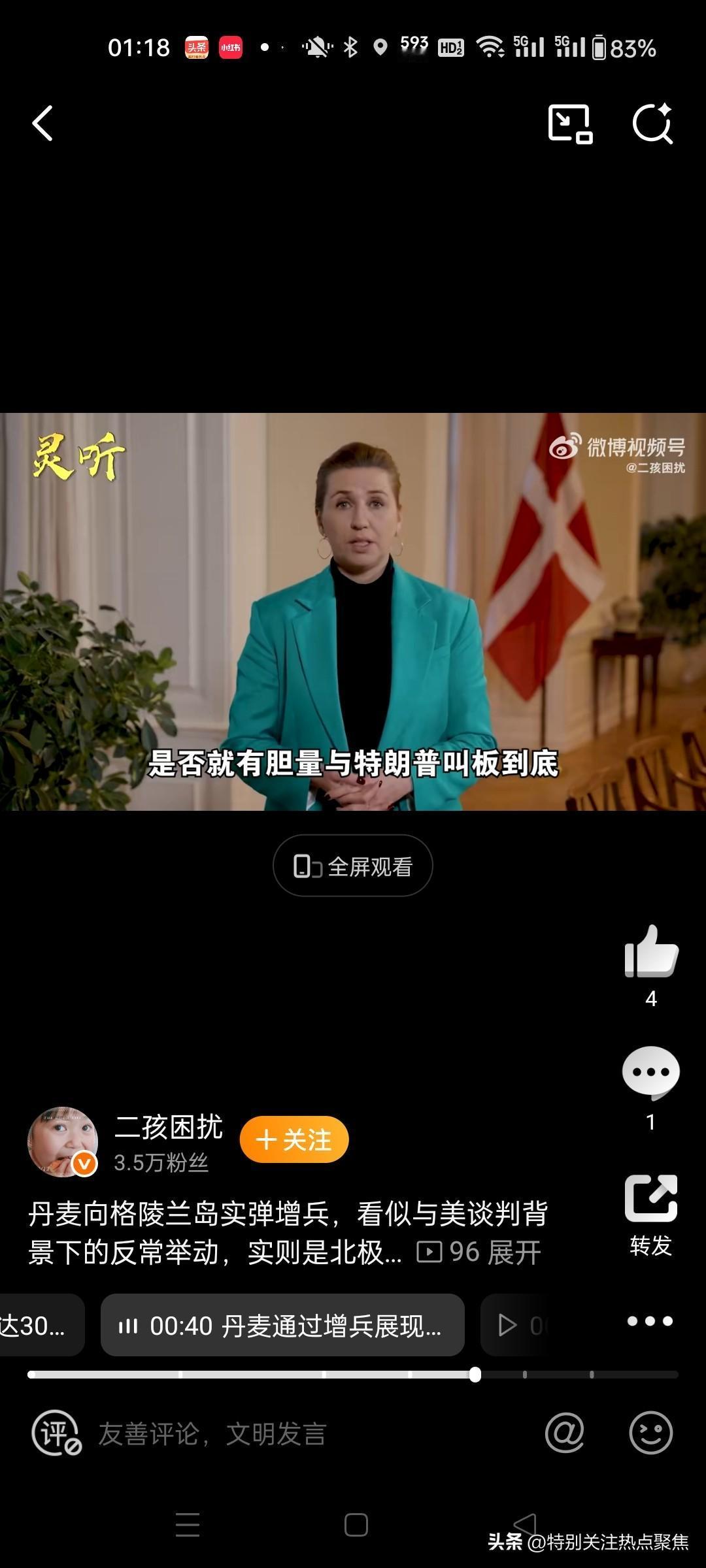 丹麦人保卫国土的决心真让人动容!特朗普想吞并格陵兰岛,丹麦国防部长直接放话,美军敢入侵,士兵就先开枪再请示,这魄力没谁了。格陵兰岛各党派也坚决不同意加入美国,岛民还上街示威。欧洲多国也发表声明支持丹麦。 可这局势也挺复杂。格陵兰虽是丹麦自治领,但距离丹麦几千公里。后来欧洲八国联军支援丹麦,结果阵容让人尴尬,加起来不到200人,美国驻军却远超这个数。丹麦外交大臣会谈后也说双方分歧大。不过丹麦人这勇敢保卫国土的精神,值得所有人致敬🫡。