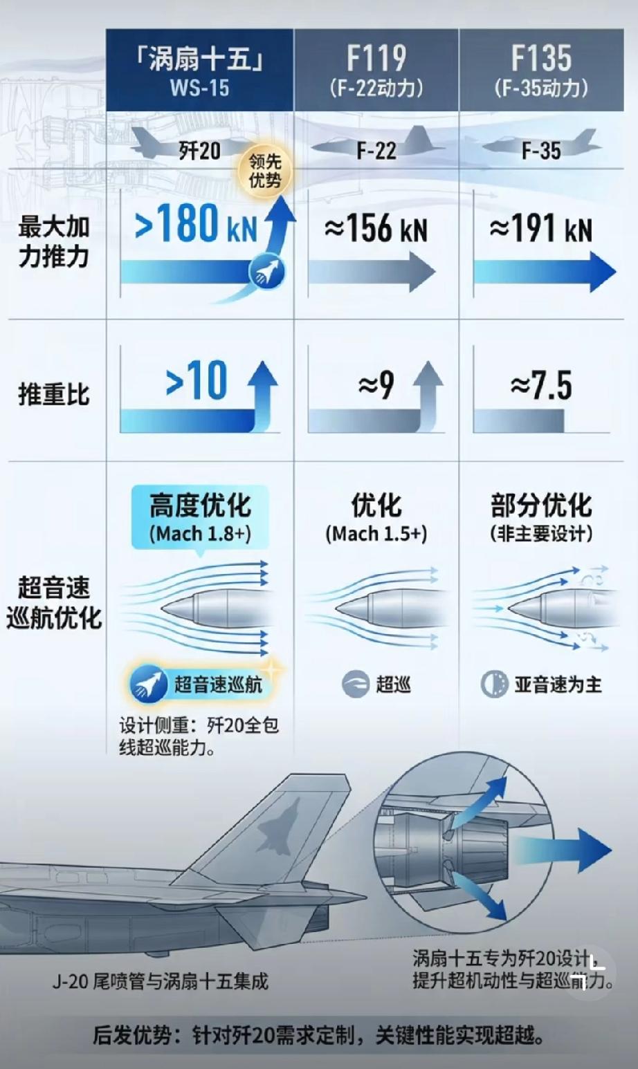 中国航发大突破!涡扇15量产!歼20终迎完全体,中国航发扬眉吐气…… 中国航空工业终于啃下航发硬骨头!涡扇15正式量产列装! 歼20总算解锁真正的“完全体”,这颗纯纯的中国心,直接让五代机战力拉满! 早前歼20列装还靠俄制发动机,动力短板全靠优秀气动设计弥补,军迷心里总憋着股劲。 从涡扇10到涡扇15,一路攻坚克难,终于甩掉航发这块心病! 涡扇15加力推力18吨级、推重比超10,对比美军F-22的F119发动机优势明显。 让歼20实现真正的超音速巡航,高速机动性再上台阶,空战实力直接跃升! 军事 歼20完全体 涡扇15量产