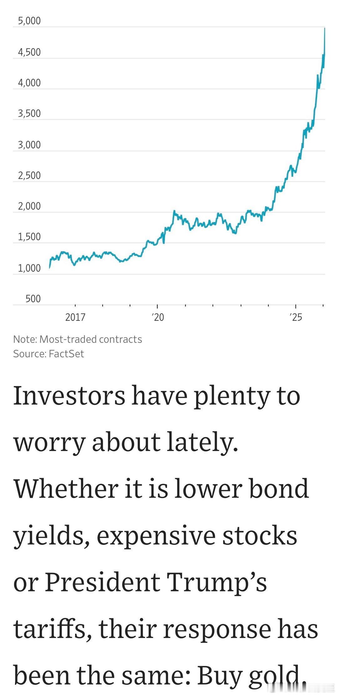 2024黄金📈27%,2025📈65%,2026已涨15%,每盎司已经五千美元股票太贵?买黄金美元贬值?买黄金美联储降息?买黄金全球贸易战?买黄金央行避险?买黄金社媒焦虑?买黄金… 个人和机构,面对不同问题,采取了同样反应:买黄金~所以供不应求、一直在涨