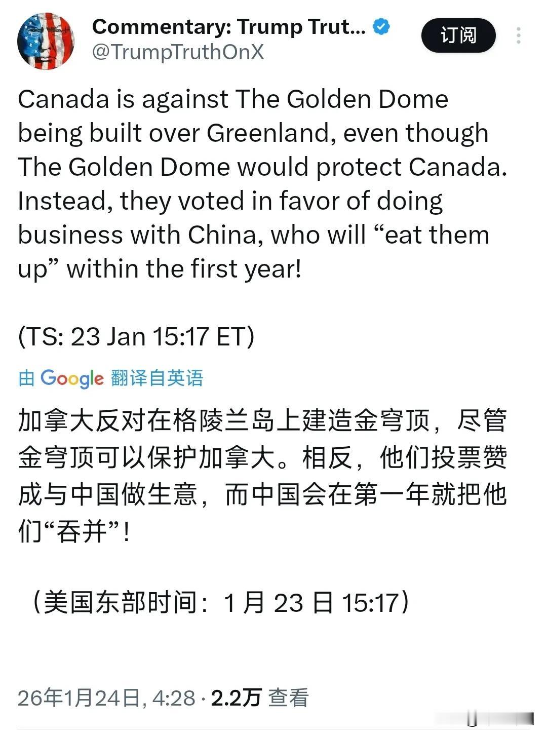 特朗普今天(北京时间1月24日)发文写道:“加拿大反对在格陵兰岛上建造金穹,尽管