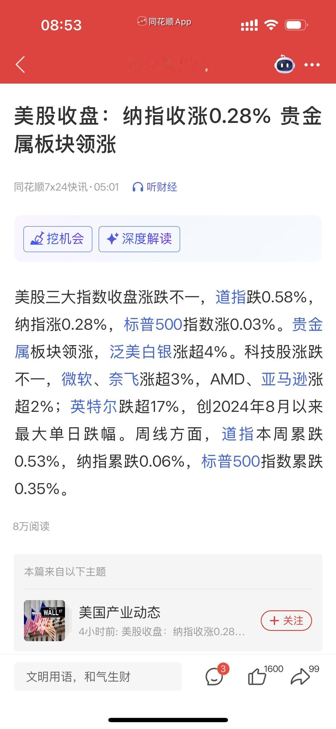 美股分化收跌,避险情绪升温 昨夜美股收盘,三大指数涨跌不一,道指跌0.58%,纳指涨0.28%,标普500微涨0.03%,周线则集体收跌。 贵金属板块领涨,泛美白银涨超4%,凸显市场避险情绪升温,在全球经济复苏不确定性与地缘风险交织下,资金转向黄金、白银等安全资产。 科技股内部分化明显,微软、奈飞涨超3%,AMD、亚马逊涨超2%,但英特尔暴跌17%,创2024年8月以来最大单日跌幅,其业绩不及预期引发对半导体行业的担忧。 对A股而言,贵金属板块的强势或带动相关情绪,科技股分化也会传导至国内赛道,资金更青睐业绩确定的龙头。不过近期A股与美股联动性减弱,后续仍需聚焦国内政策与经济数据,同时关注美联储降息预期与科技巨头财报动向。