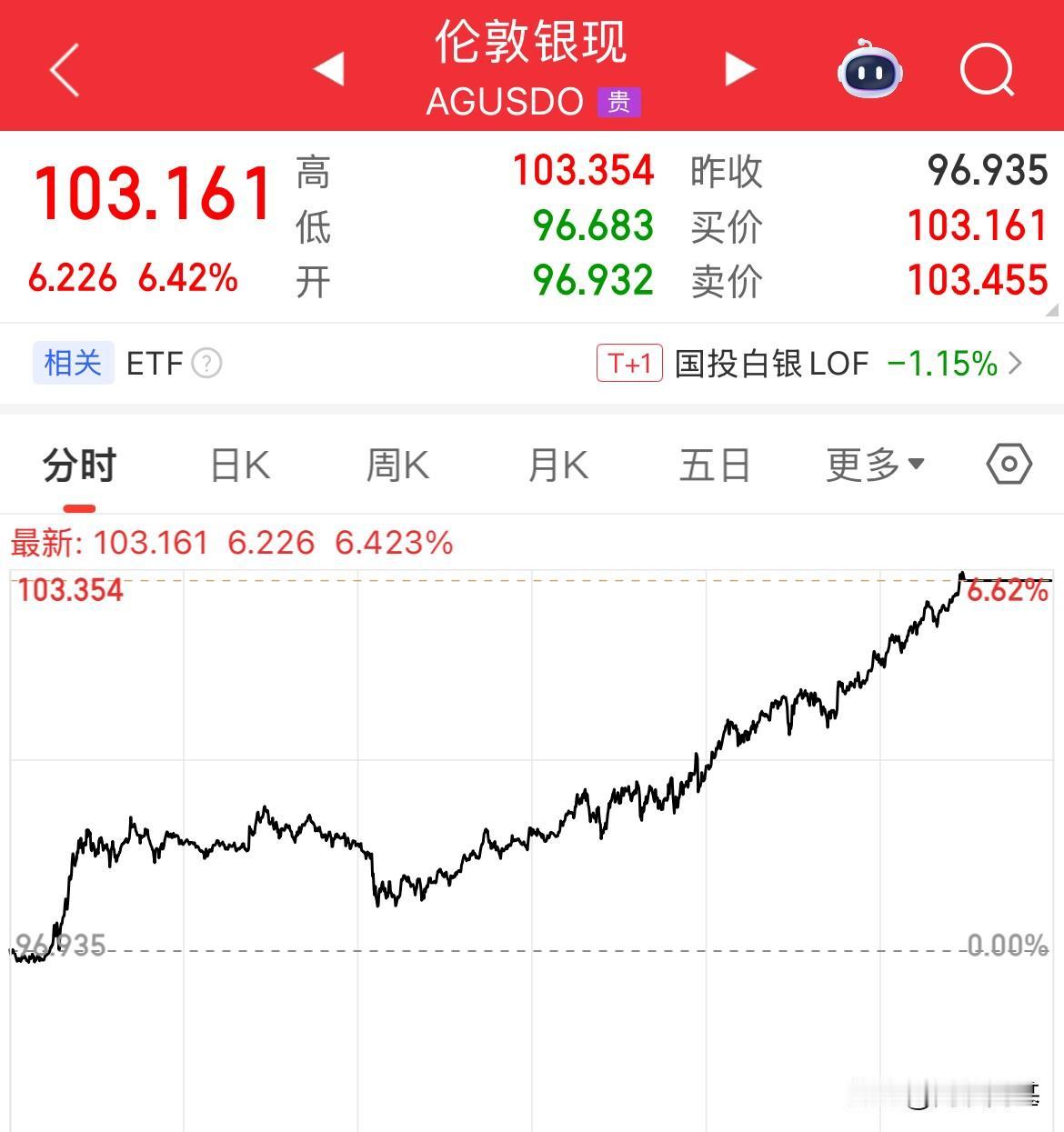 什么样的利空消息才能挡住贵金属上涨趋势,现货白银大涨6%,直从96美元一路突破97、98、99、然后震荡后一路猛冲至103美元/盎司,无惧任何利空和消息,一路猛涨 新年以来累计涨幅44%,两个月时间涨幅超80%,感觉又要翻倍的意思了。 选择真的比什么都重要,思维、格局、认知、学习比什么都来的重要。