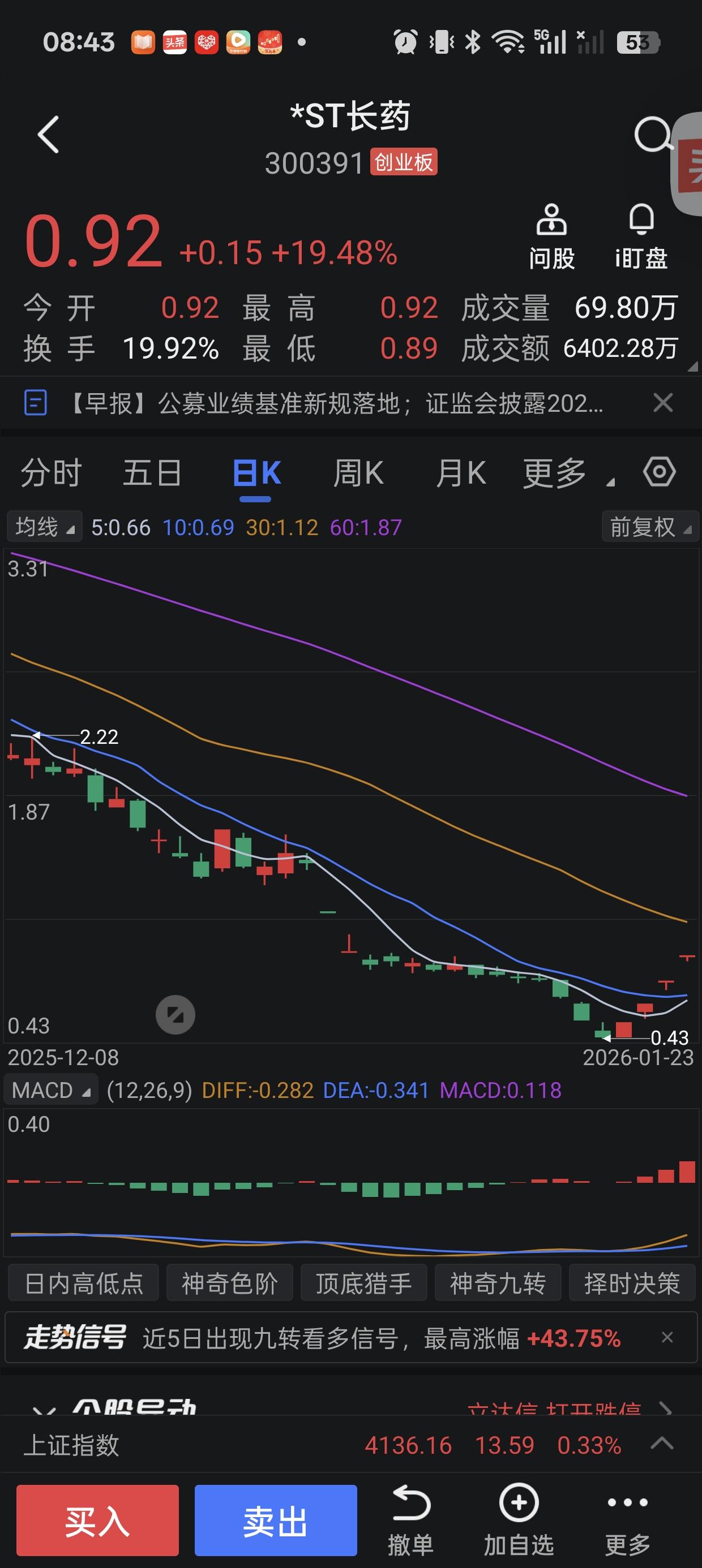 A股。买进ST长药的散户,惊天暴雷。这次又有多少散户,被迫闭关修炼。人家涨停闭关修炼,是利润越来越多,你这修复是直接走火入魔。 ST长药公告,将于1月26日起停牌,好家伙我一看4个涨停,全是20厘米的大长腿。我再一看,主力资金都在流出,主力都在跑,市值只剩几个亿。散户怎么有胆量冲进去,不得不佩服,你们的胆量,这下山顶站岗,山顶的风,凉嗖嗖。又一批散户,宣布破产。 其实,要有预兆,这家企业已经,连续多次发出风险警示,还是有人,为了赌一把,赌赢了全家幸福,赌输了,从头再来。