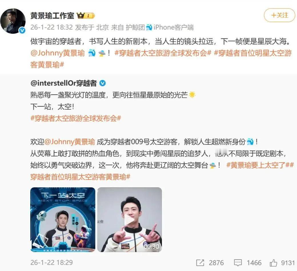 300万一张船票,黄景瑜把内娱卷到太空! 这可能是这俩天最炸的新闻了吧。 黄景瑜成为内娱明星第一☝️人获得如此殊荣。 据说这次太空旅行人选,并未开放公众报名通道,而是由直接发出的定向邀请。 为啥会是黄景瑜? 我觉得这与他的个人素质、明星形象以及观众口碑有着千丝万缕的联系。 他是个铁汉,不论是在角色扮演上,还是在综艺里蹦极、跳伞,都彰显了他独特的魅力。