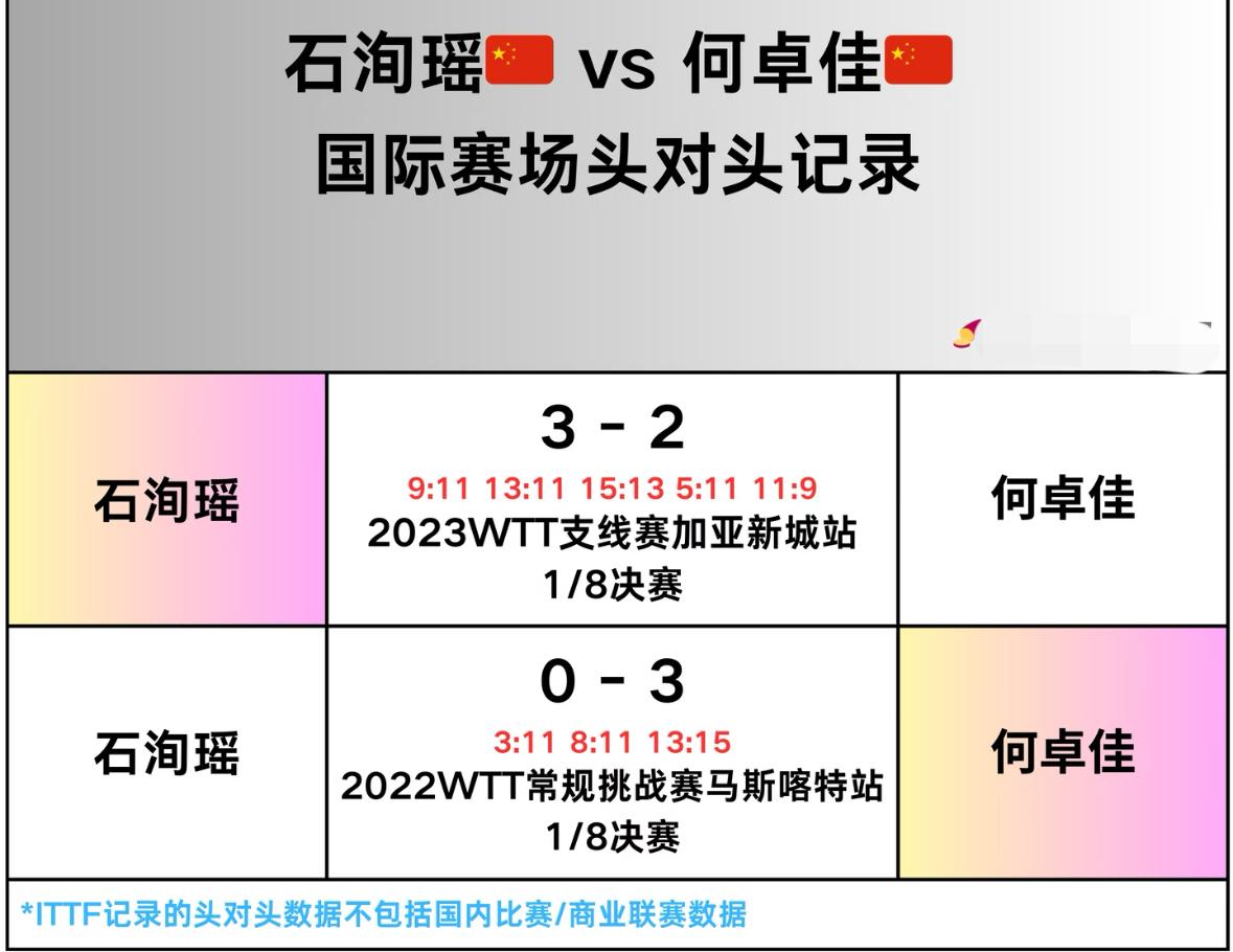 何卓佳与石洵瑶的头对头记录——马斯喀特常挑女单决赛对阵 何卓佳VS石洵瑶! 从以往的交手记录来看, 何卓佳与石洵瑶各有胜负, 而且最近两年没有交手过, 何卓佳是特殊打法, 队内很容易打她,破解她的技战术! 何卓佳的技术是吃生不吃熟, 全运会就是别人适应她两局, 然后迅速占据上风…… 所以何卓佳想赢就要速战速决! 石洵瑶的单板质量很高, 相持能力强, 正反手没有技术漏洞, 所以这场决赛注定精彩, 她们都需要这个冠军增加信心, 鼓舞士气! 何卓佳加油, 石洵瑶加油👏……