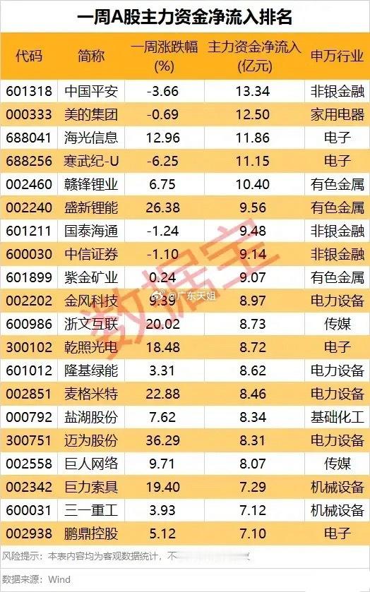 本周(1.19-1.23)主力资金净流入靠前个股梳理!本周主力资金净流入个股规模从7.10亿元到13.34亿元不等。从行业分布看,非银金融、电子、有色金属、电力设备是资金重点流入领域,既体现大金融板块的低位布局,也反映科技成长、新能源资源赛道的高景气度。部分个股出现“资金流入但股价下跌”的背离,而另一些个股则呈现资金与股价同步上涨的共振,反映主力资金“高低布局+景气追逐”的思路。个股梳理分析1. 中国平安:主力资金净流入13.34亿元居首,股价下跌3.66%,属非银金融行业。估值处于低位,获主力资金逆势布局,后续需关注保险行业政策与业绩修复节奏。2. 美的集团:主力资金净流入12.50亿元,股价微跌0.69%,属家用电器行业。受益于内需复苏与海外渠道拓展,资金流入反映对公司长期竞争力的认可。3. 海光信息:主力资金净流入11.86亿元,股价大涨12.96%,属电子行业。国产算力芯片核心标的,AI算力需求爆发推动技术突破与订单增长,获资金持续追捧。4. 寒武纪-U:主力资金净流入11.15亿元,股价下跌6.25%,属电子行业。AI芯片研发龙头,短期业绩承压但技术壁垒高,资金逆势布局或看好其长期成长潜力。5. 赣锋锂业:主力资金净流入10.40亿元,股价上涨6.75%,属有色金属行业。全球锂资源龙头,锂价企稳回升叠加产能扩张,行业景气度回暖带动资金持续涌入。6. 盛新锂能:主力资金净流入9.56亿元,股价大涨26.38%,属有色金属行业。锂盐生产企业,受益于锂价反弹与下游需求增长,业绩弹性凸显吸引资金追捧。7. 国泰海通:主力资金净流入9.48亿元,股价微跌1.24%,属非银金融行业。券商板块估值处于低位,资金流入或反映对资本市场改革的预期。8. 中信证券:主力资金净流入9.14亿元,股价下跌1.10%,属非银金融行业。券商行业龙头,受益于资本市场扩容与财富管理业务增长,资金逆势布局彰显长期信心。9. 紫金矿业:主力资金净流入9.07亿元,股价微涨0.24%,属有色金属行业。全球矿业龙头,铜金资源储备丰富,大宗商品价格上行周期下业绩增长确定性较强。10. 金风科技:主力资金净流入8.97亿元,股价大涨9.39%,属电力设备行业。风电设备龙头,海风装机需求回暖与技术迭代推动订单增长,获资金持续流入。11. 浙文互联:主力资金净流入8.73亿元,股价大涨20.02%,属传媒行业。AI营销业务布局领先,流量经济复苏带动业绩预期改善,吸引资金短期炒作。12. 乾照光电:主力资金净流入8.72亿元,股价大涨18.48%,属电子行业。LED芯片龙头,Mini/Micro LED技术升级与行业需求回暖推动产能释放,带动股价走高。13. 隆基绿能:主力资金净流入8.62亿元,股价上涨3.31%,属电力设备行业。光伏组件龙头,N型技术迭代领先,全球市占率稳定,资金流入反映对光伏景气度的认可。14. 麦格米特:主力资金净流入8.46亿元,股价大涨22.88%,属电力设备行业。新能源汽车电控业务增长强劲,技术壁垒高,吸引资金持续追捧。15. 盐湖股份:主力资金净流入8.34亿元,股价上涨7.62%,属基础化工行业。国内盐湖提锂龙头,锂价回升叠加产能释放,业绩弹性凸显,获资金重点布局。16. 迈为股份:主力资金净流入8.31亿元,股价大涨36.29%,属电力设备行业。光伏异质结设备龙头,技术迭代领先,行业扩产周期带动订单爆发,资金持续涌入。17. 巨人网络:主力资金净流入8.07亿元,股价上涨9.71%,属传媒行业。游戏标的,AI+游戏布局深化,新品上线带动业绩预期改善,吸引资金炒作。18. 巨力索具:主力资金净流入7.29亿元,股价大涨19.40%,属机械设备行业。受益于风电、光伏等新能源基建需求增长,订单改善推动股价走高。19. 三一重工:主力资金净流入7.12亿元,股价上涨3.93%,属机械设备行业。工程机械龙头,行业周期触底复苏,海外市场拓展加速,资金流入反映对业绩修复的预期。20. 鹏鼎控股:主力资金净流入7.10亿元,股价上涨5.12%,属电子行业。PCB龙头企业,受益于消费电子复苏与AI硬件需求增长,产能利用率提升带动股价上行。总结本周主力资金呈现明显的“高低切换+景气共振”特征:一方面在非银金融、家电等低估值板块逆势布局,以中国平安、美的集团为代表;另一方面在电子、电力设备、有色金属等高景气板块持续加仓,如海光信息、迈为股份。部分个股的资金流入与股价背离,反映主力的中长期布局思路;而与股价同步上涨的个股,则体现了板块景气度与资金情绪的共振。后续需关注资金流入板块的业绩兑现能力,以及市场风格切换的持续性。本文涉及资讯、数据等内容来自网络公共信息,仅供参考,不构成投资建议!