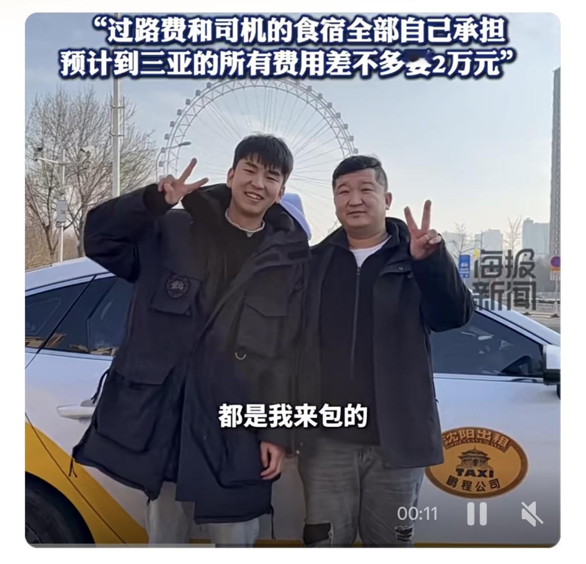 新能源出租车千里行 近日,一名男子从沈阳搭乘新能源出租车前往三亚,全程约3500公里,目前已行驶2000余公里,预计全程费用约2万元。他一路边走边玩,每日行驶约600公里,车辆依托高速服务区补能,每行驶200公里左右充电一次。