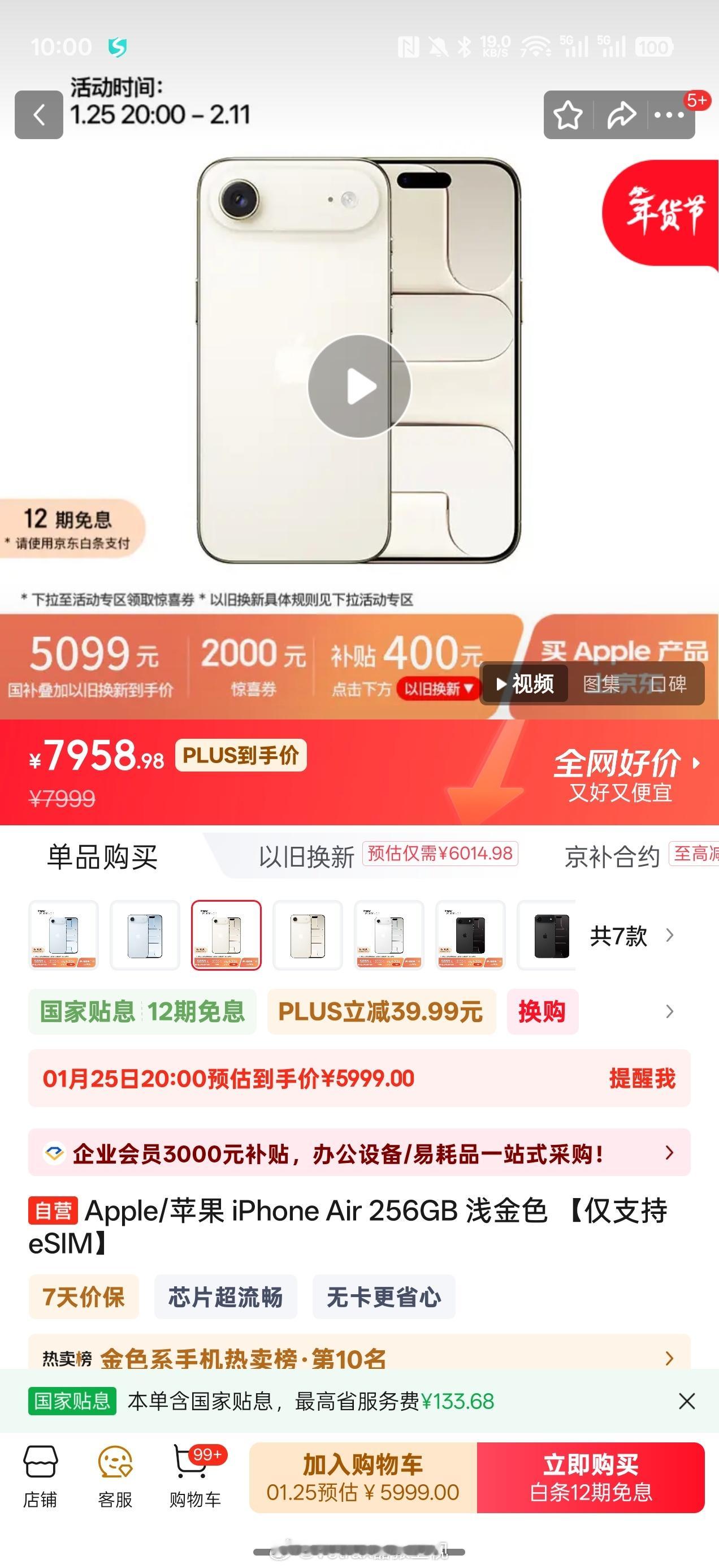同样直降 2000!苹果统一行动怎能少得了京东…… Apple/苹果 iPhone Air 256GB 浅金色 【仅支持eSIM】