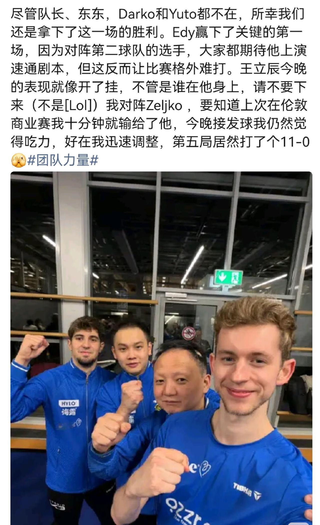 萨尔布吕肯的赛迪更新:尽管队长 樊振东 达科都不在, 所幸我们还是拿下了这一场实力强, 团队合作的力量真的太强大! 赛迪叫樊振东“东东” 哈哈哈😂, 我们的樊振东在异国他乡遇到的 队友也这么可爱, 咋还知道“无论谁在他身上, 请不要下来!”的梗? 樊振东的队友也非常厉害👍, 幽默风趣又可爱, 在主力都没在家的情况下, 拿下胜利✌️, 太值得庆幸啦! 樊振东有这样一群有爱心的 队友真棒👍, 队内气氛真的很不错👍!