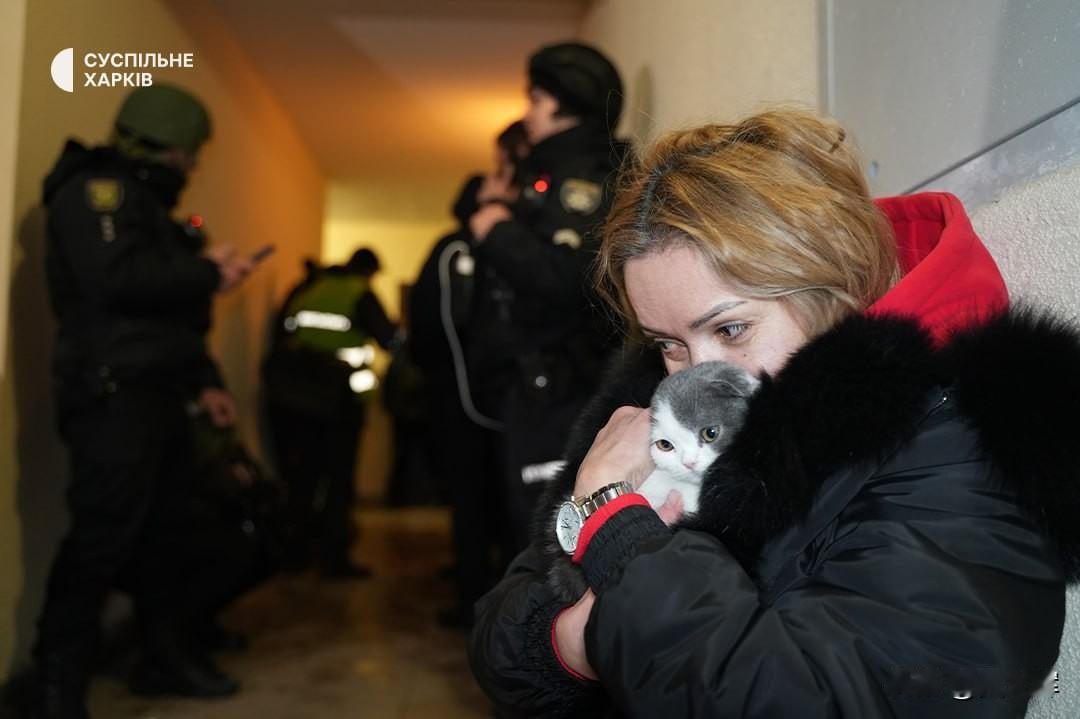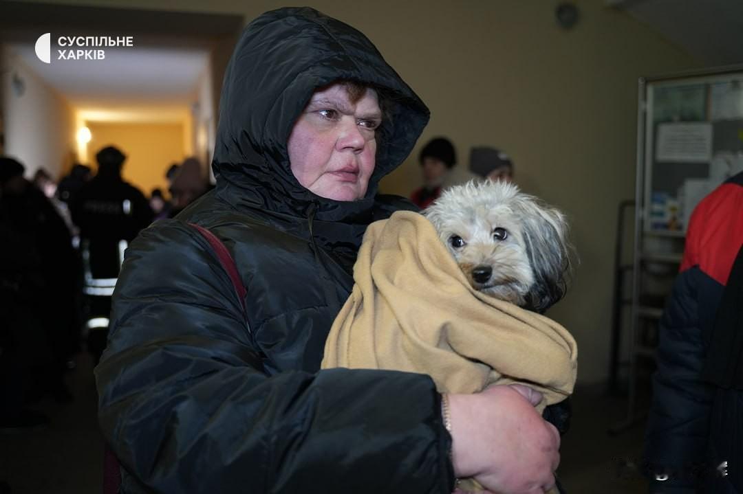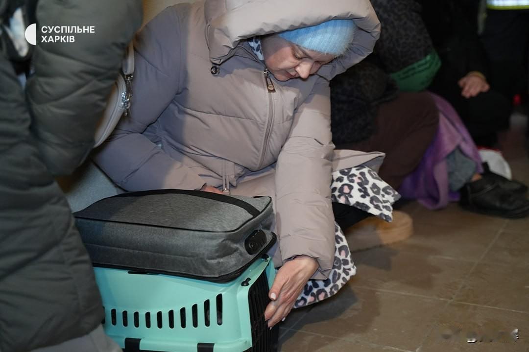 哈尔科夫工业街区一栋楼的居民在俄方“沙赫德”无人机大规模袭击期间,携带宠物在避难所中。