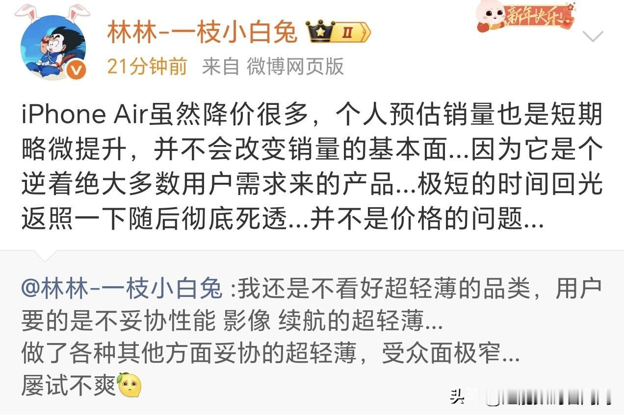 IPhone Air大降价,荣耀的Air首销成绩也出来了,官方的口径是首销当日销量超过iPhone Air。根据我查到的数据,iPhone Air国行版于2025年10月22日正式开售,苹果官方未公布首销当日的具体销量 。但从市场公开数据来看,首销周(10月22日-10月29日)激活量约5万-5.5万台 ;首销三天激活量约3万余台。单电商平台首销日销量约2万余台。 也就是说,荣耀的Air全平台首销激活量在2万+的成绩。 今天iPhone Air开始大降价,但我觉得消费者不买iPhone Air是因为这个机器除了薄,其他都不能满足于消费者,起到的效果最多也是短期内的增量,这点荣耀的高管林林也表达得很清楚了。