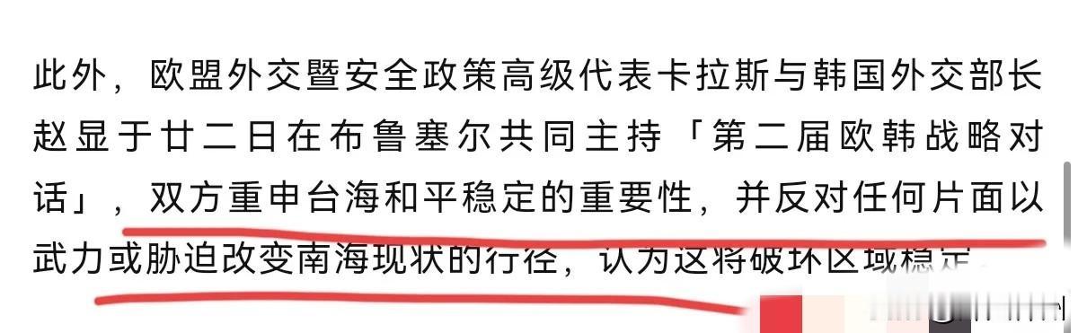 没想到韩国也如此首鼠两端!1月24日,根据岛内媒体报道,韩国与欧洲举行了第二届欧韩战略对话,韩国外长赵显与欧盟外交安全政策高级代表卡拉斯举行了会晤。而在会晤后,韩欧发表声明声称,双方重申台海和平稳定的重要性,并反对任何片面以武力或胁迫改变南中国海现状的行径,认为这将破坏区域稳定。 评几句: 韩欧勾连妄议台中国海南中国海,韩国首鼠两端终将自食苦果 1月24日,据岛内媒体报道,韩欧举行第二届欧韩战略对话,会后竟联合声明妄议台海南海局势,韩国此番操作,尽显首鼠两端的外交投机嘴脸,实在荒唐! 台海是中国内政,南中国海问题由地区国家协商解决,轮不到韩欧这等外部势力置喙。双方口称关注区域稳定,实则违背一个中国核心原则、粗暴干涉中国内政,本质是借议题搞地缘博弈,蓄意搅局亚太地区。 韩国此前一面重申恪守一个中国原则,一面又与欧盟勾连踩线,这种两面三刀的外交投机行径,既是对中韩外交共识的背叛,也是对自身国家利益的短视消耗。 地区稳定从不是外部势力操弄的筹码,韩欧逆势操弄涉华议题,既违背国际道义,也必将损害与中国的双边关系。韩国这般首鼠两端的外交投机,终究只会搬起石头砸自己的脚,自食苦果!