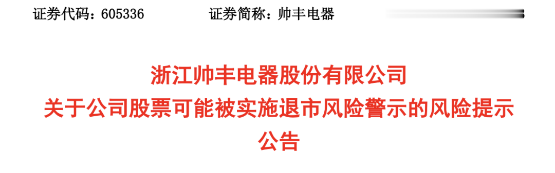 集成灶公司帅丰电器(605336)或将被实施财务类强制退市风险警示。