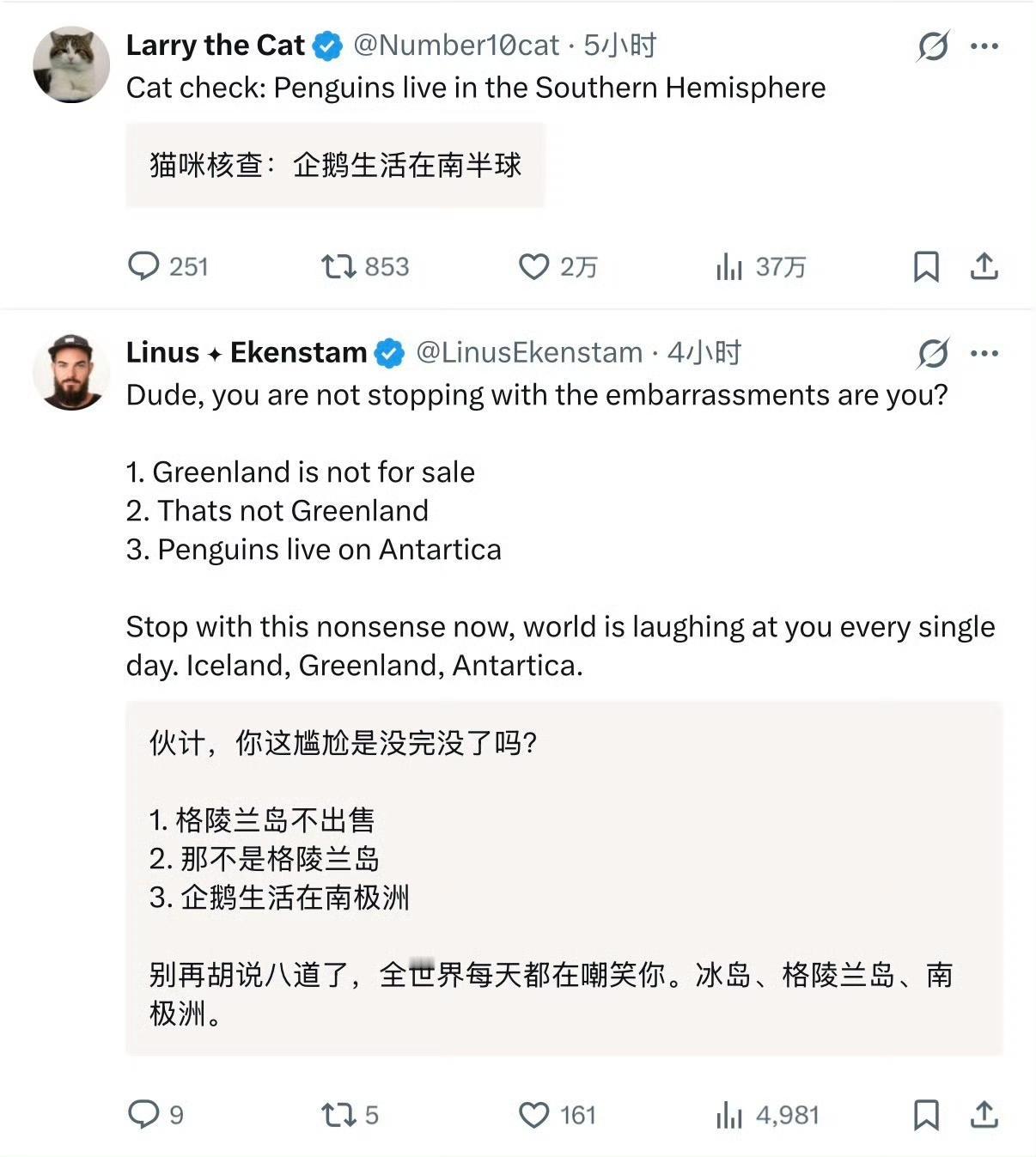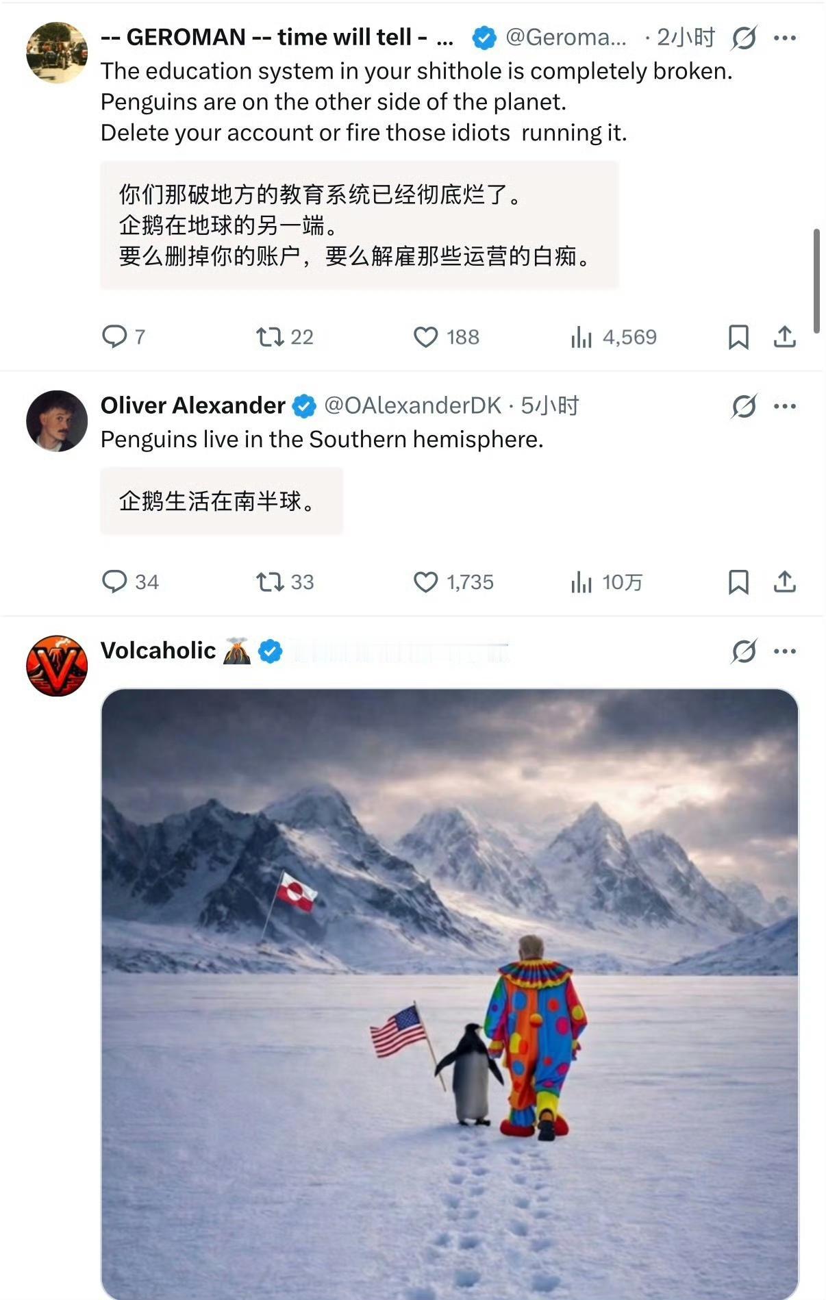 白宫官方账号发了一张图片,特朗普牵着一只企鹅在雪地上走,企鹅手里拿着美国国旗,配发文字是“拥抱这只企鹅”。美国战争部的官方账号也发了一张五名美军和一只企鹅并排走的图片,配发文字“成为勇士,拥抱企鹅”。 评论纷纷说格陵兰没有企鹅,企鹅在南极洲,但这些评论只知其一不知其二啊。 首先格陵兰岛可以有企鹅,现在我国很多动物园都有企鹅,格陵兰岛肯定可以让企鹅生存。 其次,这两条发文也妹提格陵兰啊,万一白宫和美国战争部这两条就是想要南极洲呢?