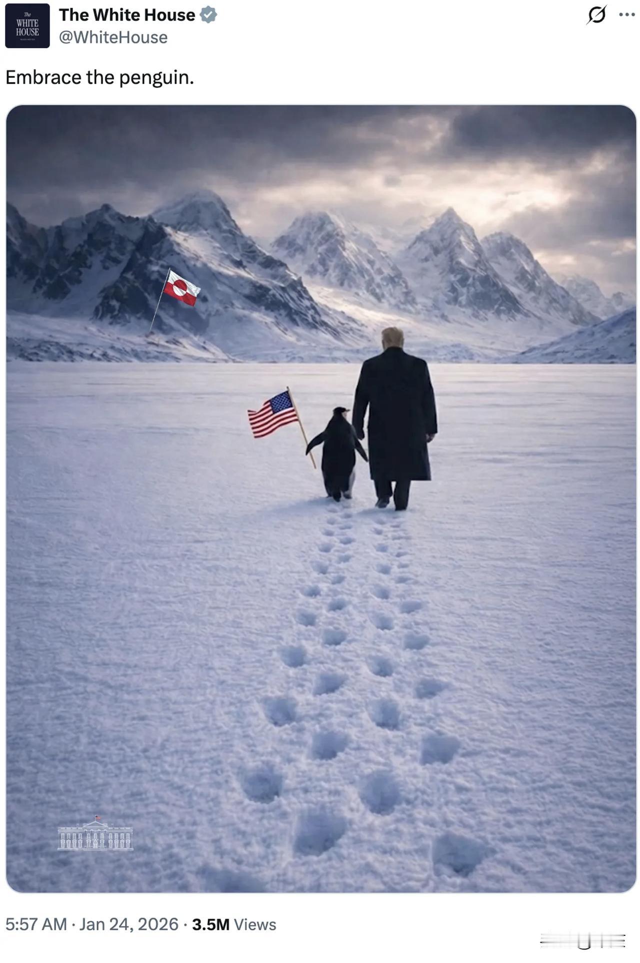 特朗普牵着举美国国旗的企鹅漫步格陵兰岛雪地,配文“拥抱企鹅”,问题是格陵兰岛根本没有企鹅! 企鹅是南极原住民,格陵兰岛属于北极圈,只有北极熊、北极狐,别说野生企鹅,连动物园引进都得算跨半球出差。为了给夺取格陵兰岛造势,白宫不仅强行让企鹅移民北极,还让它举着美国国旗当道具人。 2019年特朗普就想收购格陵兰岛,被丹麦直接拒绝,现在又靠AI图旧事重提,连基本的地理常识都懒得核对。为了抢资源、控航道,连企鹅都能被拉来当殖民工具人,把美国“为了利益不讲常识”的底色暴露得明明白白。 格陵兰岛民众早就明确反对美国染指,白宫却靠一张错误的AI图自嗨,仿佛把企鹅P到北极,就能把格陵兰岛“P”成美国领土。建议白宫下次作图前先百度:“格陵兰岛有什么动物”,别再让企鹅跨半球打工了,毕竟这里还有北极熊。