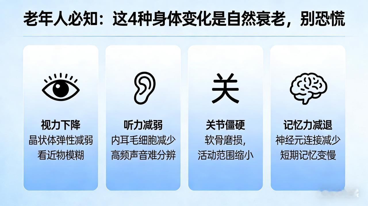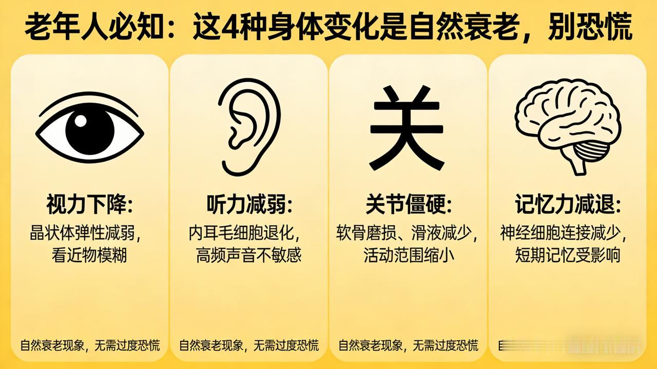 老年人必知:这 4 种身体变化是自然衰老,别恐慌 致咱家的老宝贝:别被体检报告吓着,这4种“病”其实是岁月的痕迹 亲爱的爸妈,最近是不是又盯着体检报告上的“异常”二字叹气,甚至还要翻箱倒柜找药吃?快停下!咱们得好好聊聊,人上了年纪,身体就像用了几十年的老车,零件磨损是自然规律。以下这4种情况,真不是病,别自己吓自己,更别瞎折腾! 1. 骨头长“刺”(骨质增生) 拍片子发现关节上有“骨刺”,听着吓人,其实它是关节为了保持稳定自己长出来的“加固包”,就像皮肤长皱纹一样自然。只要不疼、不肿、不影响走路,它就是你身体的一部分,千万别去相信什么“神药”能化掉骨刺,乱治反而伤身。 2. 心脏“门”关不严(瓣膜反流) 心脏彩超显示“二尖瓣/三尖瓣反流”,这是因为瓣膜用久了,就像老门有点漏风。绝大多数老人都有这种“生理性反流”,只要是轻度的,且没有胸闷、气短的感觉,就不用管它,定期复查比吃药管用。 3. 脑子“转得慢”(良性健忘) 刚放下的钥匙就忘了,话到嘴边想不起来?这叫“老年良性健忘”,不是痴呆!痴呆是连回家的路都不认识了,而您只是反应慢了半拍。这是大脑为了省电进行的“自我修剪”,多打麻将、多聊天、多动手,脑子越用越灵。 4. 前列腺“发福”(增生) 对老爸来说,尿频、尿急、起夜多,大多是前列腺随年龄增大的正常生理改变。只要排尿不困难、没有血尿,就别当它是病。少喝酒、别憋尿、注意保暖,比吃啥补药都强。 最后叮嘱一句: 人老了,有点“小毛病”才是真健康!咱们要做的不是把这些“皱纹”熨平,而是保持好心态,吃好睡好,适当运动。但如果出现剧烈疼痛、晕倒或出血,一定要第一时间去医院!别瞎担心,咱们一家人健康快乐才是最重要的!