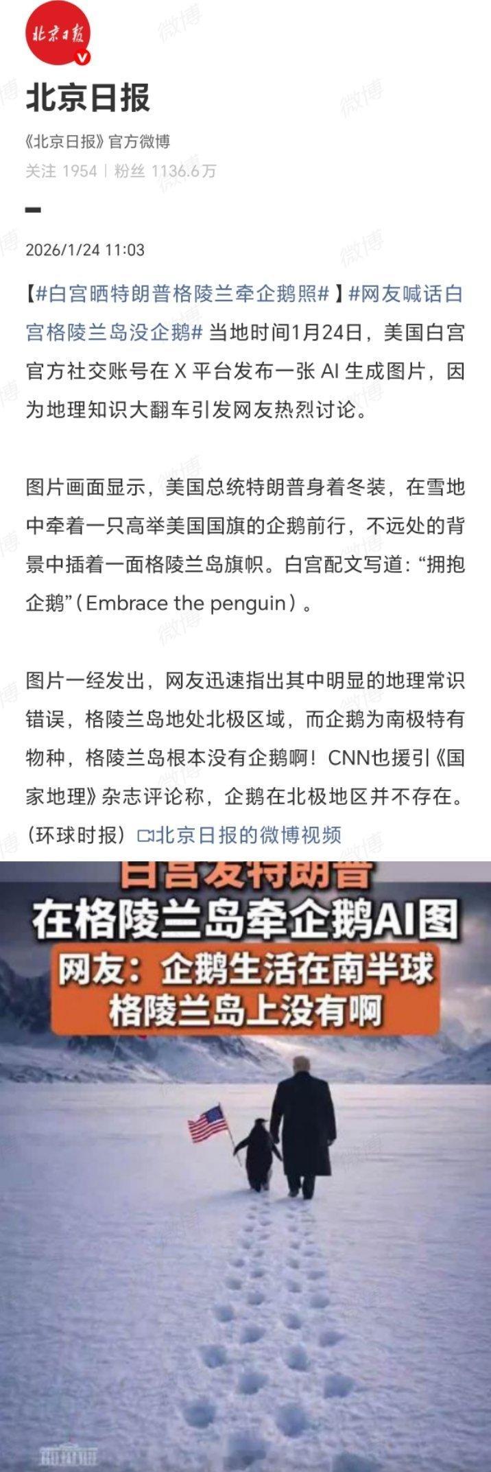 白宫晒特朗普格陵兰牵企鹅照翻车白宫用AI给特朗普造了只“北极企鹅”,却暴露了比技术更荒诞的现实——政治表演已到了连基本地理常识都能虚构的地步。企鹅举旗踏雪的画面越生动,越像对公众认知的傲慢试探:在叙事战场上,南极北极有何区别?真相早被雪藏于AI渲染的皑皑白雪中。这出数字闹剧恰是时代的隐喻:当权力热衷于制造象征,连企鹅都得被迫“北漂”。建议下次生成前,先给算法喂一本小学地理书。