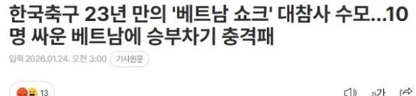 韩国媒体怒斥韩国U23男足!今天韩国U23男足在U23亚洲杯季军争夺战中输给了越南U23男足,值得一提的是,在比赛结束以后,韩国媒体在社媒上发文怒斥自家球队,该韩国媒体的文章标题为:韩国足球时隔23年惨遭“越南冲击”耻辱性惨败对阵10人作战的越南在点球大战中震惊落败。 凌晨的U23亚洲杯季军争夺战,爆出了一大冷门,韩国U23男足居然输给了越南U23,赛后韩国媒体直接在社媒上怒怼自家球队,标题看得人直呼犀利——韩国足球时隔23年惨遭“越南冲击”耻辱性惨败,对阵10人作战的越南在点球大战中震惊落败。 这场比赛的进程,说出来很多人可能都不敢信,毕竟在此之前,韩国U23和越南U23交手9次,6胜3平未尝一败,而且全场比赛韩国队在数据上完全占优,控球率达到65%,射门数更是32比5的碾压态势,可最后赢球的却是少打一人的越南队。 比赛一开始,韩国队就摆出了碾压的姿态,毕竟在他们眼里,越南队就是实力不如自己的对手,赢下比赛拿到季军就是理所当然的事。 可没想到,上半场第30分钟,越南队就抓住反击机会,由阮国越破门,率先打破了僵局,给了韩国队一记闷棍。 落后之后的韩国队才慢慢找回状态,下半场第69分钟,替补登场的金泰元扳平比分,原本以为比赛会朝着韩国队掌控的方向走,结果两分钟后,越南队队长阮庭北就用一记漂亮的任意球再次超出比分。 更戏剧性的是,阮庭北进球后没多久,因为飞铲蹬踏韩国球员李灿昱的小腿,被裁判直接出示红牌罚下,越南队不得不以10人应战。 按理说,对手少一人,韩国队又掌握着绝对的进攻优势,拿下比赛应该不难。 可韩国队偏偏掉了链子,进攻套路单调,全场61次盲目传中,大多都是无功而返,32脚射门也只命中12次,始终没能再攻破越南队的球门。 直到下半场补时最后一分钟,韩国队才靠着申敏河的进球,勉强将比赛拖入加时赛。 加时赛的30分钟里,韩国队依然占据着人数优势,可还是找不到有效的进攻方法,雷声大雨点小,面对越南队密不透风的防守,始终束手无策,双方都没能再进球,比赛最终进入点球大战。 而点球大战,成了韩国队的耻辱时刻,他们的门将全程状态低迷,7次扑点全部猜反方向,最后韩国队7罚6中,越南队则7罚全中,总比分8比9,韩国队遗憾落败。 说白了,韩国队这场输球一点都不冤,表面上是点球大战运气不佳,实际上是自身问题太多。 他们太轻敌了,从比赛一开始就带着傲慢的心态,战术单调不说,球员的终结能力也太差,明明掌握着绝对的主动权,却始终抓不住机会。 反观越南队,哪怕少打一人,也没有放弃,防守顽强,点球大战中更是沉着冷静,用拼搏赢下了比赛。 这场比赛,也是韩国足球自2003年成年队爆冷输给越南后,时隔23年再次在正式比赛中倒在越南队脚下,这也是为什么韩媒会怒称这是“耻辱性惨败”。 其实这几年,越南足球一直在稳步提升,而韩国U23则出现了明显的下滑,本届赛事他们一共输了3场比赛,先后不敌乌兹别克斯坦、日本和越南,早已没有了昔日太极虎的风采。 这场惨败对韩国足球来说,应该是一记沉重的警钟,他们不能再躺在过去的功劳簿上轻敌了,战术需要创新,球员的心态也需要调整,否则以后可能还会遭遇更多这样的“耻辱”。 而越南队的胜利,也证明了竞技体育里,没有绝对的强弱,只要拼尽全力,就有可能创造奇迹。 以上都是个人观点,对此您有什么不同的看法,可以在评论区留言讨论!!!