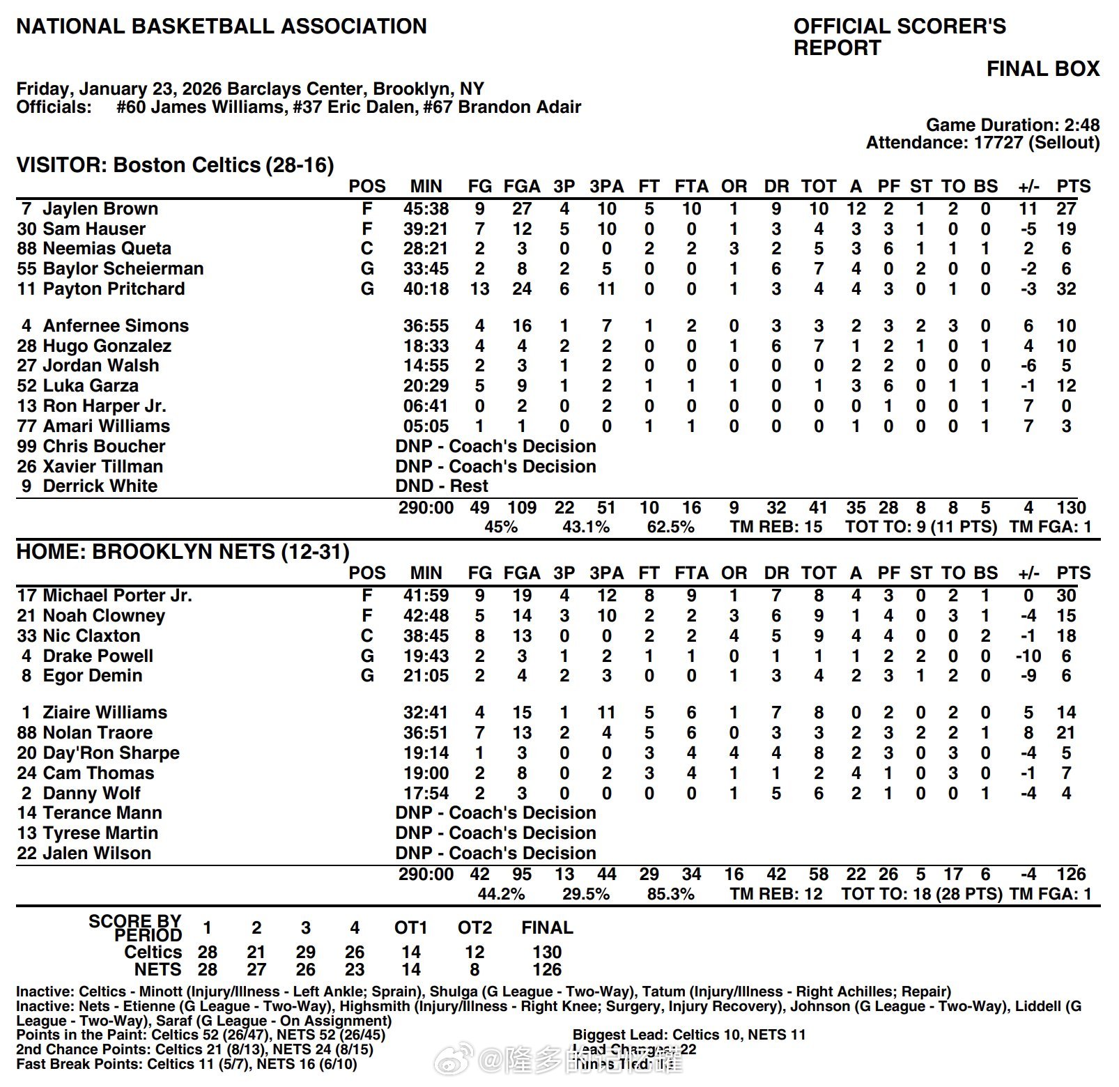 全场比赛数据📊杰伦-布朗27分10篮板12助攻安芬尼-西蒙斯10分2抢断佩顿-普里查德32分4篮板4助攻萨姆-豪瑟19分4篮板卢卡-加尔扎12分雨果-冈萨雷斯10分7篮板阿玛尼-威廉姆斯3分1助攻1盖帽