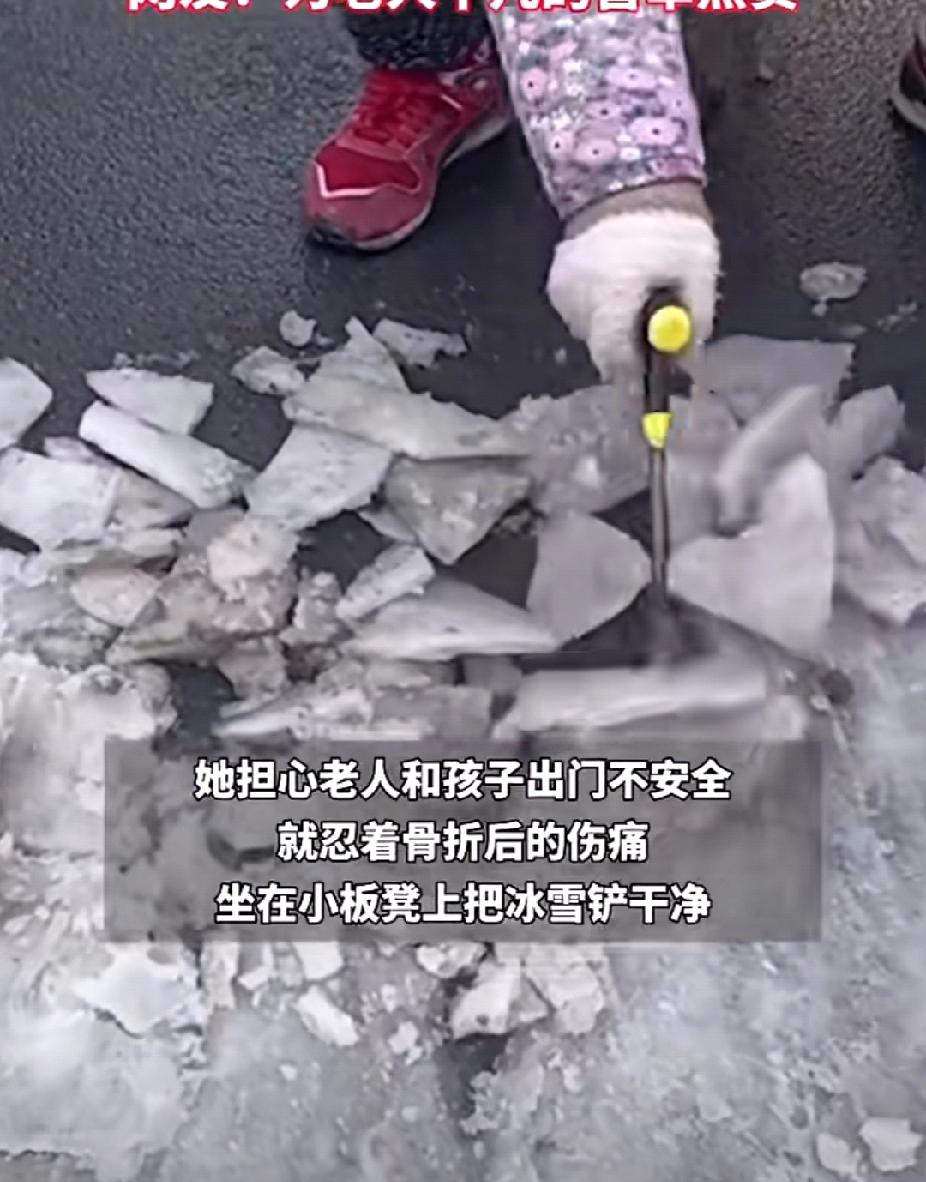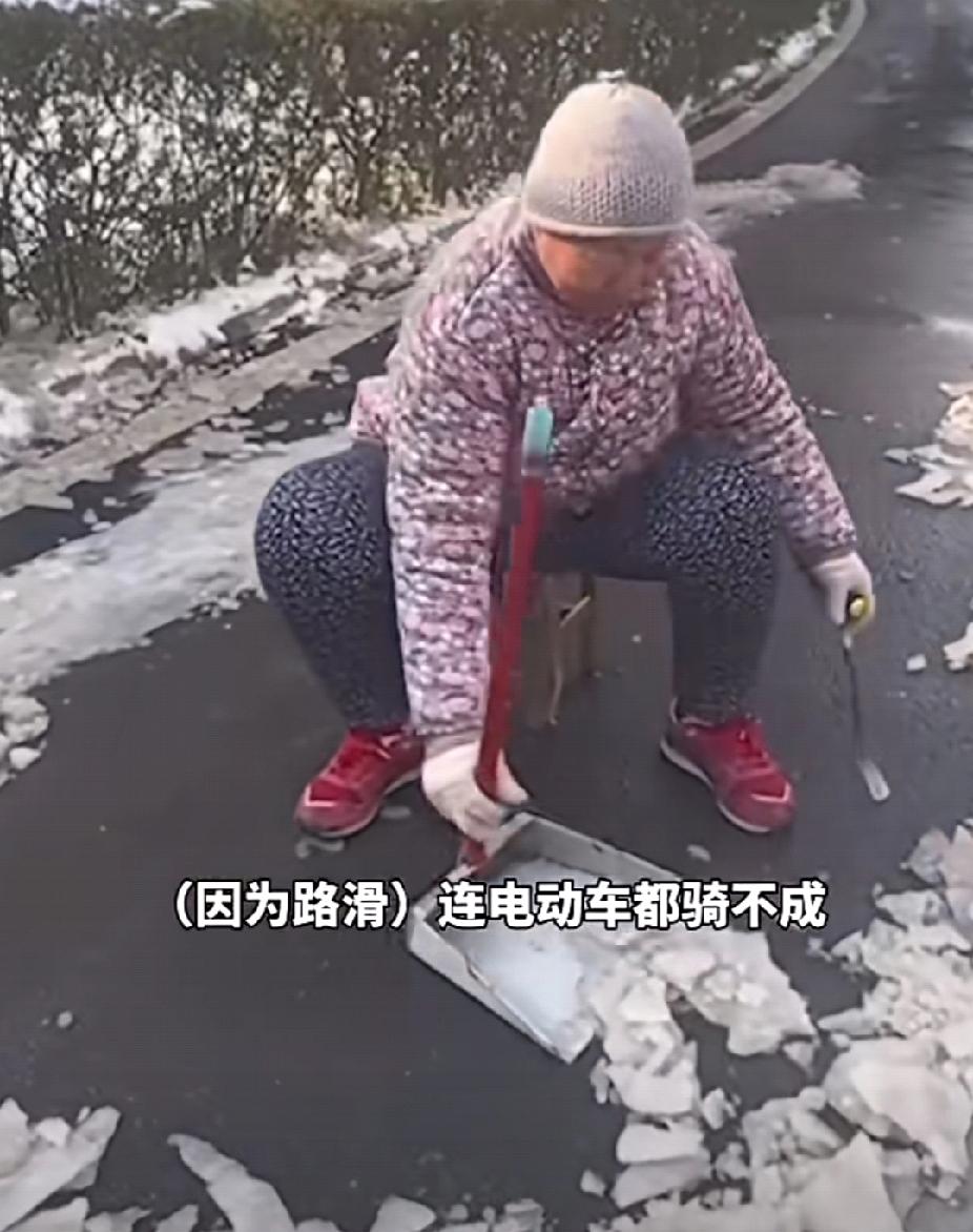 大爱无声!寒天结冰路难行,七旬老太忍骨折之痛拿小铲坐小马扎铲冰!知情人:“她是退休老教师!” 1月21日,河南平顶山某街道上出现了这样动人的一幕!化雪后又经历夜晚冰冻的路面如镜面一般光滑,路过的行人都难以站稳脚跟,电瓶车路过时更是不断的打滑倾斜,不断有人摔倒。 70岁的退休教师李淑平看到这个场景,为每一个过路的行人感到揪心!有的人滑一下就过去了,有的人摔倒后疼得龇牙咧嘴,下一个人呢?是幸运还是不幸呢? 顾不上前段时间骨折至今未愈的疼痛,李淑平搬上小马扎,拄着拐杖拿着小铲子,坐在冻得最硬的这段路上,使劲凿着坚硬的冰,一块又一块...... 一边凿着还一边嘟囔着:“看这路冻的,送学生的,上班的,骑个电动车都骑不成!”她边说边将满满一簸箕的冰块倒进绿化带。 一簸箕接着一簸箕,黑油油的沥青路面露了出来。 是的,退休后她依旧像个老师一样,喜欢叨叨叨。可是每一句唠叨,都是满满的爱,以前是对学生的爱,现在是对社会的爱与责任!让我们为老人平凡的善举点赞! 善良