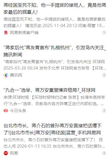 台北市市长、蒋介石的曾孙蒋万安直接把话撂下了!他当着媒体的面斩钉截铁地表示,自己绝对不可能去选下一任国民党主席。想当年蒋经国走了之后,蒋家在台湾政坛就慢慢没那么显眼了,到了第四代,蒋友柏、蒋友青这些人都躲着政治走,就只有蒋万安接了他爸蒋孝严的“政治活儿”。 麻烦看官老爷们右上角点击一下“关注”,既方便您进行讨论和分享,又能给您带来不一样的参与感,感谢您的支持! 说到蒋家,那可是台湾政坛的一个大名鼎鼎的家族。蒋介石,蒋经国,这些名字你听过不止一次,每一个都带着历史的分量。 可是人说到蒋家第四代,光环已经慢慢褪色了,蒋友柏、蒋友青这些人都选择躲得远远的,政治?算了,咱们玩点别的吧,做生意、搞投资什么的,比在台上拼个你死我活轻松多了。唯独蒋万安,接了他爸蒋孝严的“政治活儿”,走上了选台北市长的道路。 这一路走来,其实挺有意思的。蒋万安没选择去蹭家族名号去争党内最高位,而是脚踏实地做市政。 这种选择,说明了几个事儿:第一,他清楚现在台湾选民看人的眼光,不再是“哎,这人姓蒋就行”,大家更在意政绩,是你能不能把事办好,能不能让台北变得舒服,能不能让市民少操心。 第二,他聪明,不想把自己卷进党内的明争暗斗。国民党内部派系林立,主席的位置你抢了,明争暗斗全是标配,累不累?蒋万安选择不抢,表面上是退,实际上是高明,稳住自己再说,政治上稳健也是一种智慧。 有人可能会说,蒋家这一脉怎么就只剩他玩政治了?其实不奇怪。政治这事儿,前面几代靠家族名望撑起来可以,但第四代就不一样了。社会变了,选民变了,光有血统根本不够。 蒋万安看得明白,家族光环不等于无限通行证,你得有真本事,得让人看到你能干。市长位置,是一块练兵场,也是一块试金石,能不能把台北管得顺顺的,能不能把市民的需求听进去,这才是硬实力。至于党主席?那就留给别人去“秀演技”吧。 台湾现在政治格局复杂,选民越来越理性,党派斗争的魅力大不如前,反而市政成绩成为选民投票的关键。这对蒋万安来说是个好事,他不用为了党内头衔去争吵撕裂,也不用为了血统去刷存在感。 选民要看的是你干得怎么样,能不能解决交通堵塞、房价问题、公共建设。蒋万安把精力集中在台北市政上,正好符合这个趋势。 而且,他这样做还有个隐形好处:减少了家族光环带来的压力。蒋家这个名字,一提起来就是历史与政治的重量,有时候你做事,别人只看你姓蒋,爱你不爱你全靠这个姓。 蒋万安选择专注市政,不去抢党主席,其实是把自己的身份和能力分开。你看得清楚了,他不是在靠血统做政治游戏,而是真的想用手上的资源把事情办好。这一点,对选民来说,比空喊口号更靠谱。 回头看蒋万安的成长轨迹,他一路走来,其实充满了家族教育的痕迹。政治底子扎实,有亲情和资源支撑,但他没有完全依赖家族光环去开挂,而是用行动证明自己。这种稳健和务实,正是很多政治人物缺乏的。 你会发现,台湾现在的选民更挑剔了,他们希望看到的是政绩,是能力,是干事的效率,而不是空洞的历史传承。这也是为什么蒋万安的选择,既明智又符合时代潮流。 说到底,政治并不是光靠血统就能稳住的游戏,尤其是到了第四代。蒋万安明确拒绝党主席,专注台北市政,是聪明的自我保护,也是一种智慧的战略布局。 他懂得什么时候该亮剑,什么时候该稳住阵脚。你想想,如果他去抢党主席位置,必然陷入复杂的党内斗争,哪怕家族光环在,也未必能保住平安。反倒现在,把市民的需求放第一,把自己的政绩打磨好,才是长期稳健的投资。 这件事还透露一个小信息:台湾政治正在发生微妙的变化。过去,家族名声可能可以撑起一切,但现在,选民更现实,他们看重的是你能不能把日常问题解决好,能不能让生活更顺畅。 蒋万安的选择,恰恰呼应了这种趋势。他没去玩高位游戏,而是用实实在在的政绩去赢得口碑,这种务实、稳健、聪明的作风,其实比光靠姓蒋更能走得远。 蒋万安选择稳扎稳打,专注实务,这种行为本身就是一种政治智慧的体现。对他来说,市长这个位置不仅是实践能力的舞台,更是赢得民心的关键。家族光环是加分项,但不是万能钥匙;政绩才是硬通货。 这一次蒋万安明确拒绝参选国民党主席,不去卷入派系斗争,而是把精力用在台北市民的日常生活中。这是一种稳健的智慧,也是一种务实的选择,充分体现了台湾选民更看重政绩而非血统的趋势。 蒋万安走的,是一条平衡家族光环与现实政治的路,看得明明白白,也干得漂亮。未来如何,还得看他怎么把市政这一摊子活儿弄顺,但至少现在,他稳住了自己,也稳住了民心。