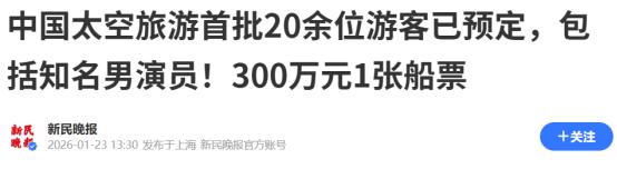 真是没想到!2026年1月23日报道,中国飞船300万1张旅游票,第一批上天多人身份曝光! 我国有一个关于太空的项目备受国际高度关注,该项目就是中国太空游项目。早在2024年10月份的时候,相关机构就已经开始预售亚轨道飞行船。 仅4分钟的时间内,就售罄百万元优惠票。该项目一直都是我国重点关注的项目之一,所以针对首批游客,相关部门更是进行了严厉的筛选。 就在2026年1月23日的时候,据媒体报道,首批游客已经确定。据悉首批游客仅有10位,而这10位来自不同的领域。 有来自学界,商界,航天界,艺术界,娱乐界,网红界等多领域的太空游客。其中男演员黄景瑜,更是成为重点讨论人物之一。他本人也表示很荣幸能够成为一名太空旅客,将乘坐中国人自己的飞船亲身抵达那片星海。 这是我国商业航天领域,首个载人飞船全尺寸试验舱着陆缓冲关键技术验证项目。所以该项目对于我国航天领域来说,具有着里程碑的意义。 国人在关注首批“上天”的游客时,更格外关注“上天”门票多少钱?据媒体的报道,一张船票售价为300万! 此事带来的讨论热度非常高,而针对这个票价,有不少网友表示,300万的票价直接将普通大众拒之门外,太空旅行将成为精英专属的体验。针对这一点,有专家学者进行分析后认为,未来的价格也许会和高铁票差不多。 对此,您怎么看?如果票价真的能够跟高铁票差不多,您是否也想去太空旅游一番? (信息来源:中国太空旅游首批20余位游客已预定,包括知名男演员!300万元1张船票-新民晚报)