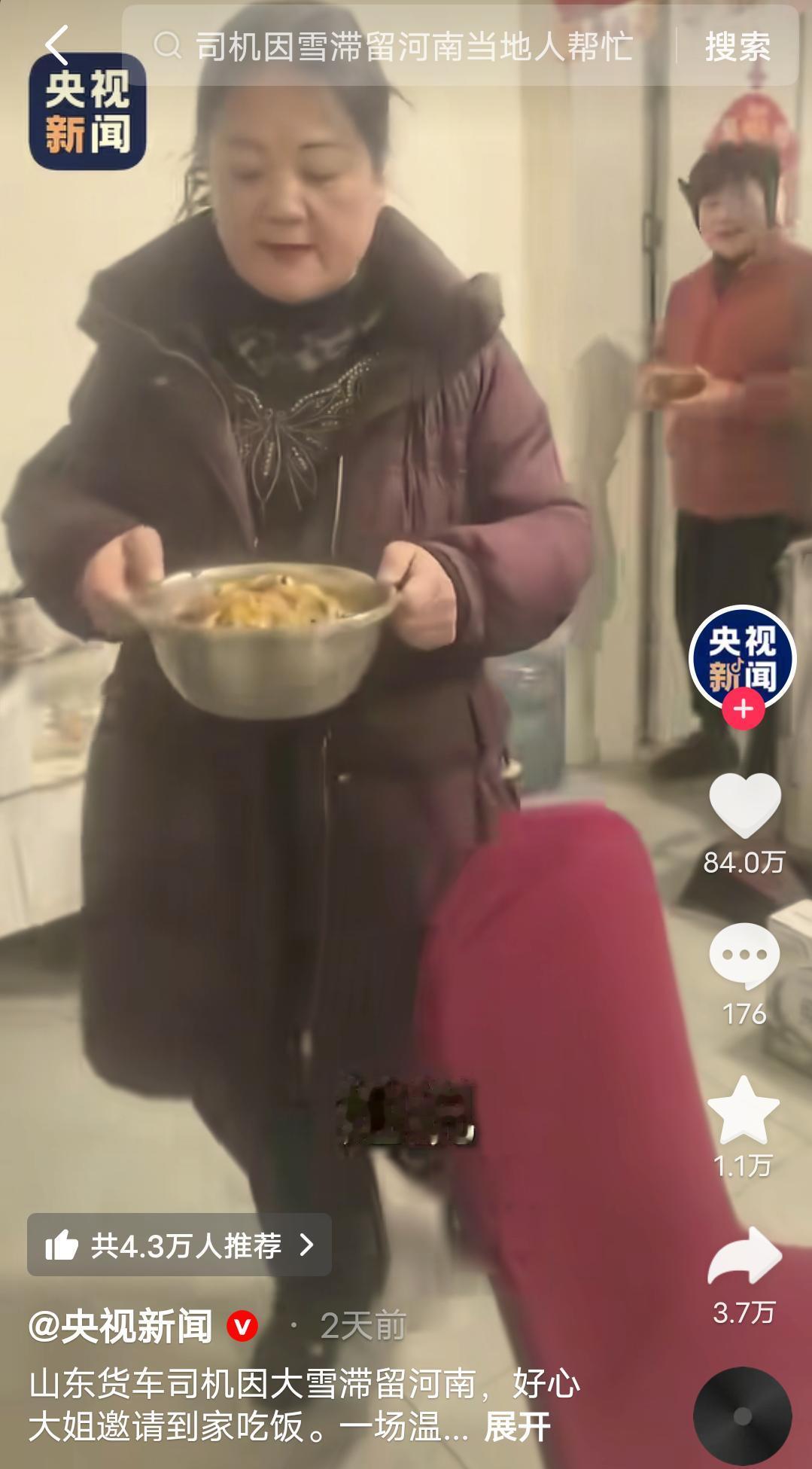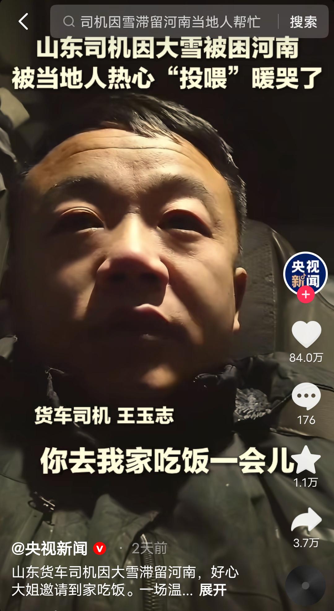 河南人民的暖心举动火到央视! 1月19日,山东货车司机王玉志拉着满车货行至河南南召,突遇暴雪封路,只能把大车停在路边干等,前不着村后不着店的,心里满是无奈。跑大车的都懂,这种突发天气最磨人,身不由己的滋味别提多难受了。 天色渐暗,肚子饿得直叫,王玉志翻出车上的方便面准备泡一碗凑合。常年跑长途,风餐露宿是常态,吃口热乎饭都是奢望,泡面对付一餐早成了家常便饭。可刚撕开包装,车门就传来敲门声,大雪天的荒郊野外,谁会来关心一个货车司机?打开门,一位大姐站在雪地里,肩头落着雪花,脸上却挂着特别实在的笑,直愣愣问:“师傅,走不了了吧?吃没吃饭?跟我回家吃口热的去。” 王玉志第一反应就是婉拒,萍水相逢的,哪好意思平白麻烦人家,连忙摆手说车上有泡面。可大姐根本不跟他见外,嗓门亮堂又暖心:“那玩意儿顶啥用?天这么冷,吃口热的才暖身子。我弟也是开大车的,你们在外头熬更守夜的难处,我都清楚,别客气,我回去给你做烩面。” 这话一下子戳中了王玉志的心底,跑了这么多年路,听过不少客套话,这般实打实的关心,真的少见。盛情难却,他跟着大姐往家走,路过村口超市,想着空着手去不合适,想买点东西谢大姐,结果超市老板一听他是被困的货车司机,立马热情招呼:“师傅,晚上来我家吃,我给你炒俩菜,光吃烩面不够,老吃泡面身体扛不住。” 接连遇到素不相识的陌生人掏心掏肺对自己好,王玉志这个七尺汉子,眼眶忍不住微微发潮。到了大姐家,推开门就是扑面而来的暖意,炉火烧得旺旺的,和外面的冰天雪地判若两个世界。没一会,一大碗热气腾腾的羊肉炝锅面端了上来,汤浓味鲜,面劲量大,看着这碗面,王玉志鼻子一酸。 他跑了八年大车,天南地北都去过,见过人情冷暖,受过委屈也挨过刁难,却从没被陌生人的善意这么狠狠打动过。这个见过无数风雨的老爷们,再也绷不住了,眼泪忍不住掉进碗里,赶紧低头扒拉吃面,怕大姐看见觉得矫情,可心里的感动,早就溢满了。 晚上回车上,王玉志翻来覆去睡不着,大姐的烩面、超市老板的热情,一幕幕在脑子里转。他嘴笨,不会说漂亮的感谢话,只想用实在行动回报。第二天一大早,天还没亮,他就拿着铲子悄悄去了大姐家,把门口乃至整条胡同的积雪,都仔仔细细铲得干干净净,在他看来,人家给了一碗热面的温暖,自己就该用真心回敬,这是做人的本分。 在南召滞留的两天,温暖还在继续。周边村民知道他是外地被困的司机,都纷纷伸援手,有人端来滚烫的热水,有人拿来厚被子问他冷不冷,还有人主动帮忙指挥倒车,让大车停得更安全。这些河南老乡,没一个图回报,也没一句漂亮话,就觉得人家在外遇难处,搭把手是应该的,这份刻在骨子里的淳朴,真的暖到了心坎里。 雪停路通后,王玉志临行前特意跟大姐一家郑重道谢,这份情谊,他记在了心底。回到山东,他把这段经历拍成视频发到网上,没想到一下子火了,连央视都关注到了,网友们纷纷留言,说“鲁豫一家亲,河南人是真中”。 一场暴雪,让王玉志陷入困境,却也让他在异乡收获了沉甸甸的温暖。其实这世上最珍贵的,从来都不是什么惊天动地的大事,而是这些藏在烟火气里的小善意。河南老乡的这份热情,不是嘴上说说,而是融进一举一动里的真诚。 出门在外,谁还没个遇难处的时候?一句暖心话,一口热乎饭,一个实在的帮忙,就能让困境里的人心里亮堂起来。这份陌生人之间的善意,无关名利,无关回报,只是最纯粹的人心向善。它就像寒冬里的一束光,不光暖了王玉志的路,也让我们所有人都感受到,人间烟火处,善意最动人,这份跨越地域的温暖,才是最珍贵的人间美好。