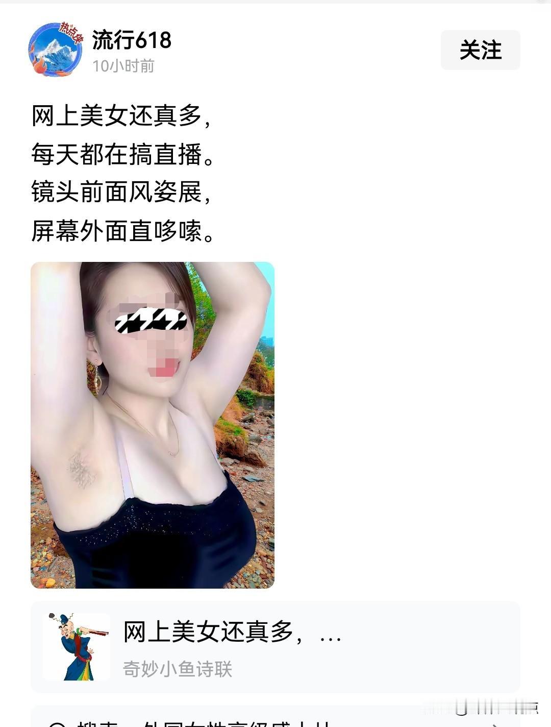 今日头条新鲜多,大千世界,无奇不有!刚刚在火车上,闲得无聊在头条溜达,看到网民昵称为(流行618)发布了美女照片并写打油诗(也可能是复制搬运的)于是我也复制搬运来,权作小笑话。打油诗为:网上美女还真多,每天都在搞直播,镜头前面风姿展,屏幕外面直哆嗦。该网民没把美女打马赛克,我替你打了!说的很真实!