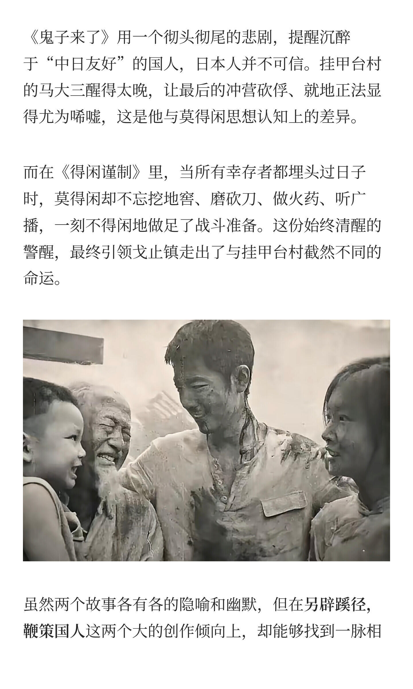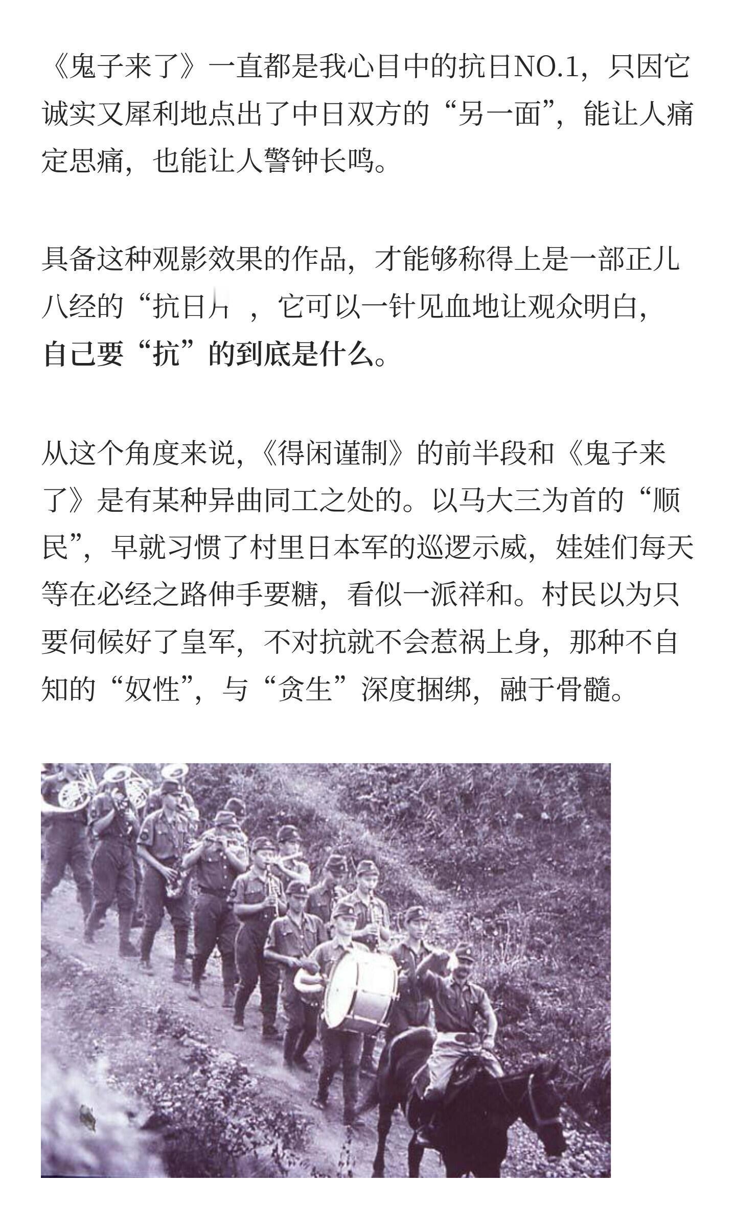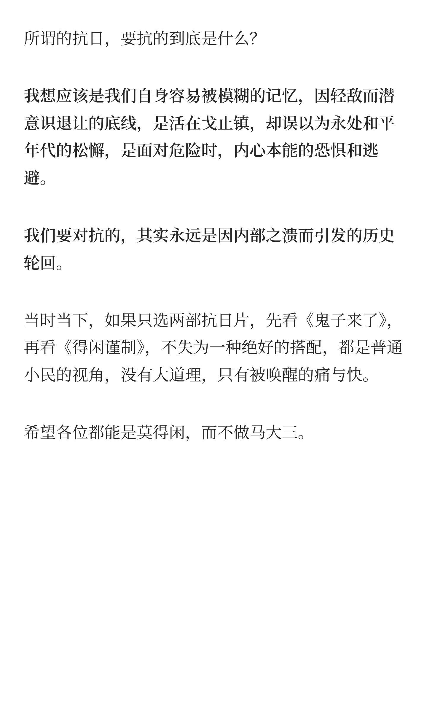 网友就姜文《鬼子来了》和兰晓龙《得闲谨制》两部作品探讨了“抗日”的深层内核,抗日电影的本质!抗日不仅是对抗外敌,更是对抗我们自身的“奴性”“软弱”与“愚昧”,比如《鬼子来了》里马大三式的麻木轻信、《得闲谨制》里戈止镇民众的自我麻痹与畏缩自保。真正要抵抗的,是因内部溃散而引发的历史轮回,是模糊的记忆、退让的底线与面对危险时的本能逃避。兰晓龙其实多部作品一直在强调,我们不能混日子,小心被日子混了!文化战也是战争肖战得闲谨制真的是一部被严重低估的优秀电影!跨年电影愿
