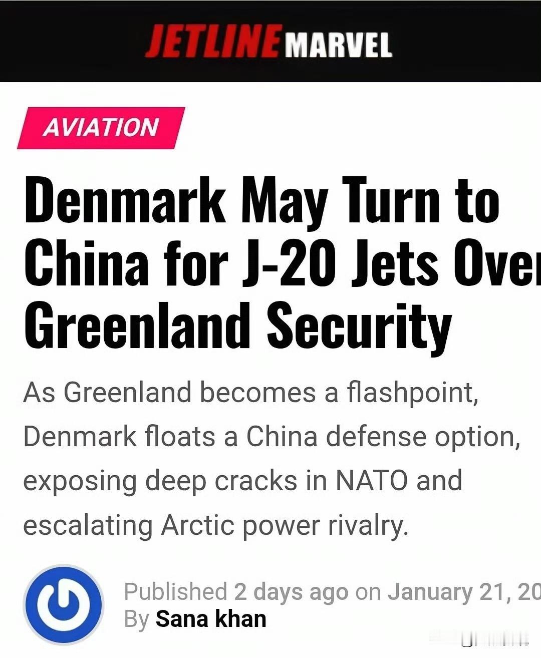 外媒报道,丹麦正考虑向中国采购歼20用来对抗美国对格陵兰岛的入侵。该报道称,为了保障格陵兰岛的安全,丹麦现有的21架美制F35A难以发挥作用,因此正在考虑同中国建立防务合作,平衡美国入侵风险。此前丹麦曾表示如果美国入侵,则意味着北约瓦解。此番考虑采购中国隐身战机,表明北约内部正在出现深层裂痕。