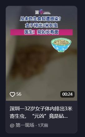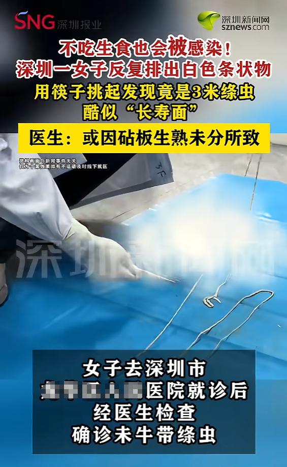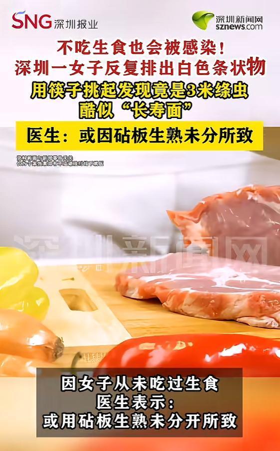 悲剧还是发生了!近日,广东深圳,一女子平时特别注意饮食卫生,从来不吃生食,可最近上厕所,却反复排出白色条状物,当医生用筷子挑起排出的虫体,才知道这是一条绦虫,并且有3米长!而原因,家中菜板生熟未分导致的!网友:头皮发麻! 近日,广东深圳一位女士的离奇遭遇,给所有自以为在“饮食够干净”这件事上做得天衣无缝的人,狠狠敲响了警钟。 当事人张女士在日常饮食的卫生把控上可谓是严防死守,生鱼片、生腌这类高风险食物不仅从不沾唇,就连涮火锅都必须坚持“煮透才吃”的原则。 然而诡异的是,她最近如厕时,竟频频发现排泄物中夹杂着白色条状异物,直至某次排出一条完整的长条物体,极度惊恐的她才匆忙奔赴医院求助。 接诊医生用器械将其挑起检视,眼前的一幕令在场所有人头皮都麻了那赫然是一条长度足足达到3米的牛带绦虫! 不过,相比于视觉冲击力极强的虫体,更令人细思极恐的是其隐蔽的感染源头。张女士百思不得其解,自己平日里如此洁身自好,怎么还会不幸中招?在医生抽丝剥茧般的反复追问下,真相终于水落石出问题出在家里那块菜板上。 据悉,她家中仅备有一块案板,家里的老人在烹饪时,无论是宰杀生肉、切分熟食还是处理蔬菜,通通混用这一块板子。更要命的是,处理完生肉后,老人仅习惯用开水简单冲烫一下,便误以为完成了消毒工序。 医生直言:这才是罪魁祸首!生鲜肉类极易携带牛带绦虫的囊尾蚴,这种寄生虫卵拥有极强的生命力,寻常的开水冲烫根本无法将其彻底灭活。一旦切完生肉的菜板未经过彻底消毒便紧接着处理熟食或青菜,虫卵就会顺势沾染到食物之中。 随着食物被吞入腹中,虫卵便会在人体肠道内安营扎寨,逐渐发育为成虫,日积月累,最终演变成了这条3米长的“不速之客”。 究其根本,许多人都陷入了一个认知误区,以为只要拒绝生食就能高枕无忧,殊不知厨房内部的交叉污染才是潜伏在身边的最大隐患。 这种“一块菜板走天下、生熟不分”的现象,在无数中国家庭中简直太常见了。老一辈人大多秉持勤俭节约的习惯,认为家里备一块砧板足矣,切完腥荤用水冲冲,接着切别的食材完全没问题。 可他们未曾意识到的是,肉眼看不见的寄生虫卵与细菌绝非水流能轻易冲走,它们会顽固地吸附在菜板的刀痕木隙中,蛰伏着等待下一次“搭便车”侵入人体的机会。 更为凶险的是,牛带绦虫一旦寄生体内,便会持续掠夺人体的营养,久而久之,患者会出现腹部不适、消化功能紊乱、体重骤减等症状。 若病情进一步恶化,甚至可能诱发肠梗阻、肠道出血等严重并发症,直接危及生命安全。张女士此番算是得天眷顾,发现得尚算及时,倘若再迁延时日,后果着实不堪设想。这就事儿无疑也给大众提了个醒——所谓病从口入,真不是说说而已。 很多时候,我们自认防护周全,却往往在那些看似不起眼的细枝末节上栽了跟头。菜板生熟分开,这话听起来虽像老生常谈,可真正在实际生活中严格执行的家庭又有几成?厨房卫生的金标准应当是:常备两块菜板、两把刀具,一块专门用于处理生食,另一块则专门负责熟食与蔬果,使用完毕务必彻底清洁消毒,并养成定期更换菜板的习惯。 千万别觉得麻烦,毕竟身体是自己的,一时偷懒或许要用惨痛的健康代价来买单。回首这三个月,张女士频繁排出白色条状物,实则是腹中虫体在疯狂“生长”,而她却一直误以为是蔬菜不洁所致。 倘若未曾排出那条令人惊骇的长虫体,她或许直至今日仍对真相一无所知,依旧被蒙在鼓里。 这种事儿,真的不能大意。 希望各位看完这个真实案例,都能回家自查一下自家的厨房习惯,有则改之,别等到真出了事才追悔莫及。 信息来源:《女子体内排出3米长虫似长寿面 医生:确诊为牛带绦虫感染》深圳新闻网
