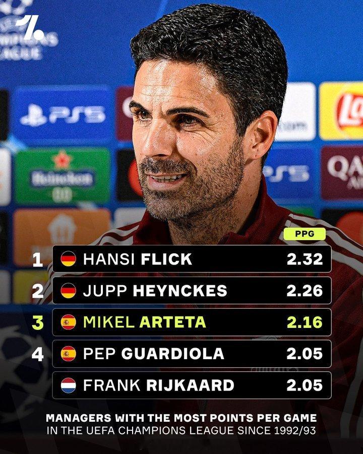 阿尔特塔在欧冠赛场的战绩堪称精英级别。😳🔥 阿森纳著名教授 英超联赛