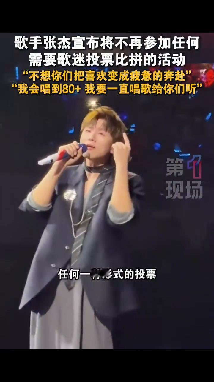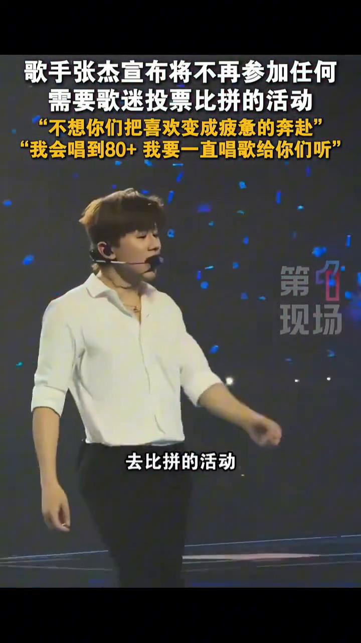 歌手张杰宣布将不再参加任何需要歌迷投票比拼的活动。 第1现场。 1月23日,四川成都。张杰:从今天起,所有需要歌迷投票的颁奖礼,所有需要你们耗费精力去比拼的活动,任何一种形式的投票我都不会再参加了。我不想你们把喜欢变成一场疲惫的奔赴。