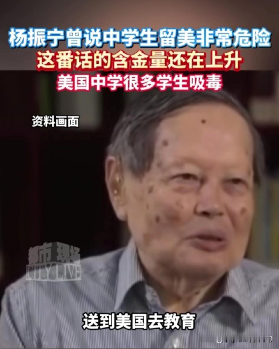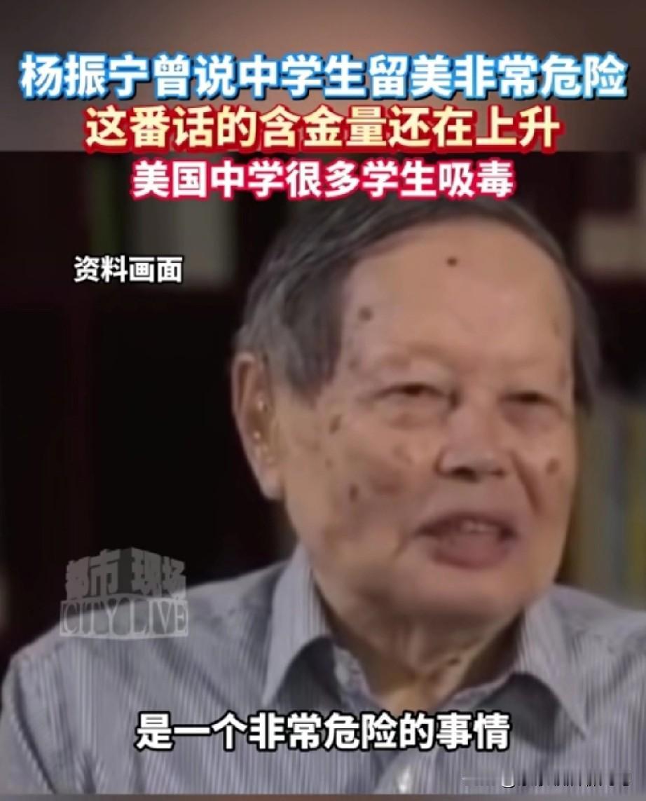 杨振宁当年说“中学生送到美国去接受教育非常危险”,那会儿很多人还不当回事,现在这句话的“含金量”却是真越看越高了。 他说,把一个中学生送到美国去,那真是危险得很。因为美国整个社会就是一个放纵的社会,虽然说允许个性发展,但都放纵得有点过头了。一个十几岁的孩子去美国,不管进哪所中学,身边很可能一堆吸毒的同学。 有网友就说,像杨振宁这种社会地位很高的人,给大家提醒这些事,其实说得挺含蓄的。说白了就是:环境太复杂,小孩子一个人去美国,想让他“学好”很难,“学坏”分分钟的事,除非家长天天盯着、跟在身边。 现在,牢A讲的故事再一次证明,杨教授的话是真实的。美国是一个看着光鲜亮丽,其实内部都是脓疮的社会。人生观、世界观都还没成熟稳定的中学生,在那种环境下,特别容易被人影响、被人带偏,甚至变成别人手里的“棋子”。