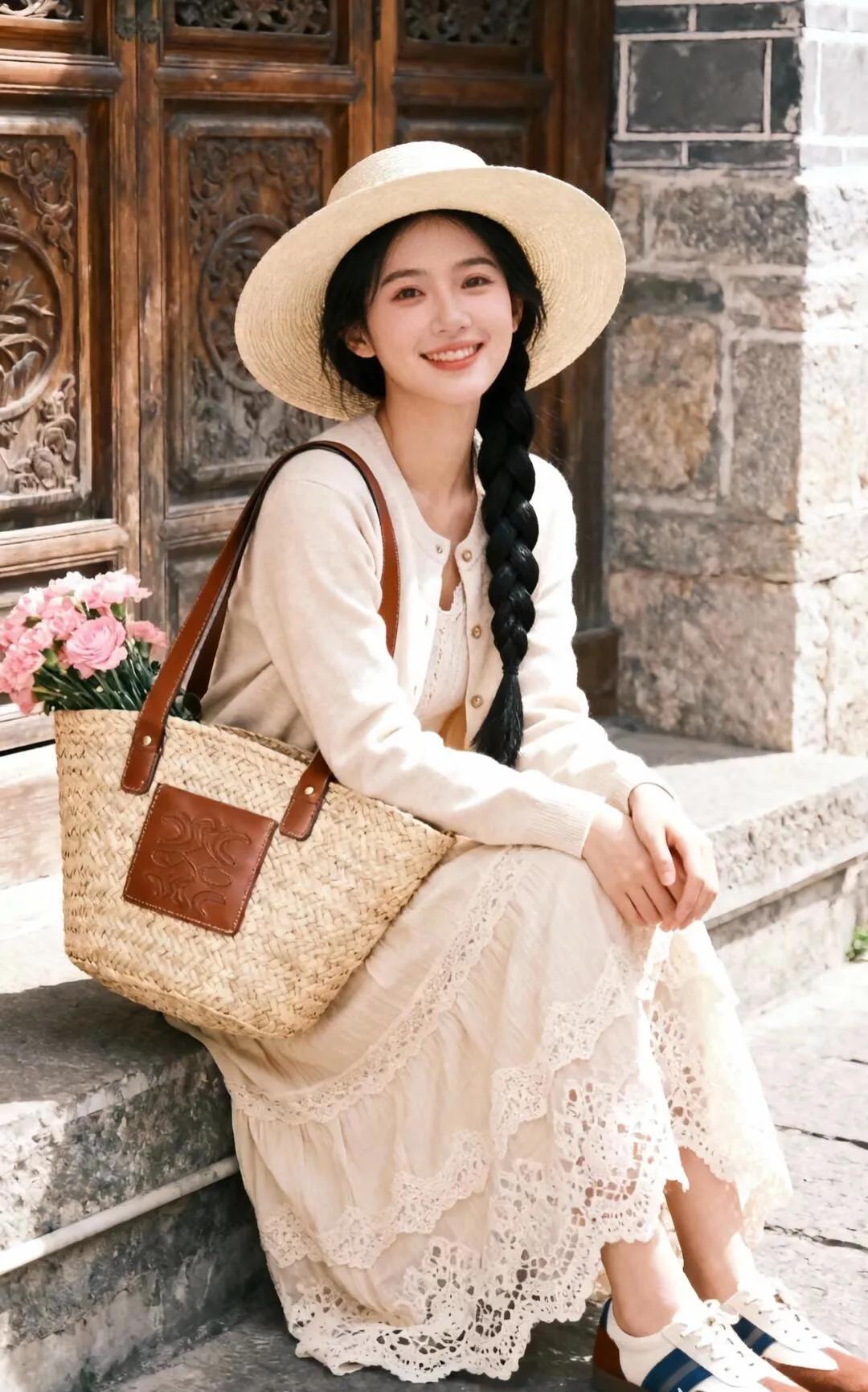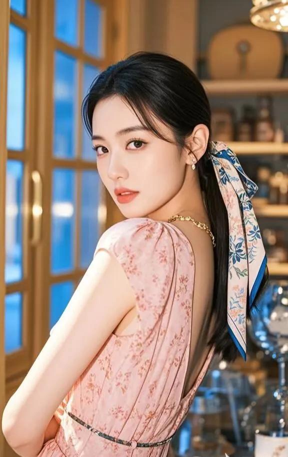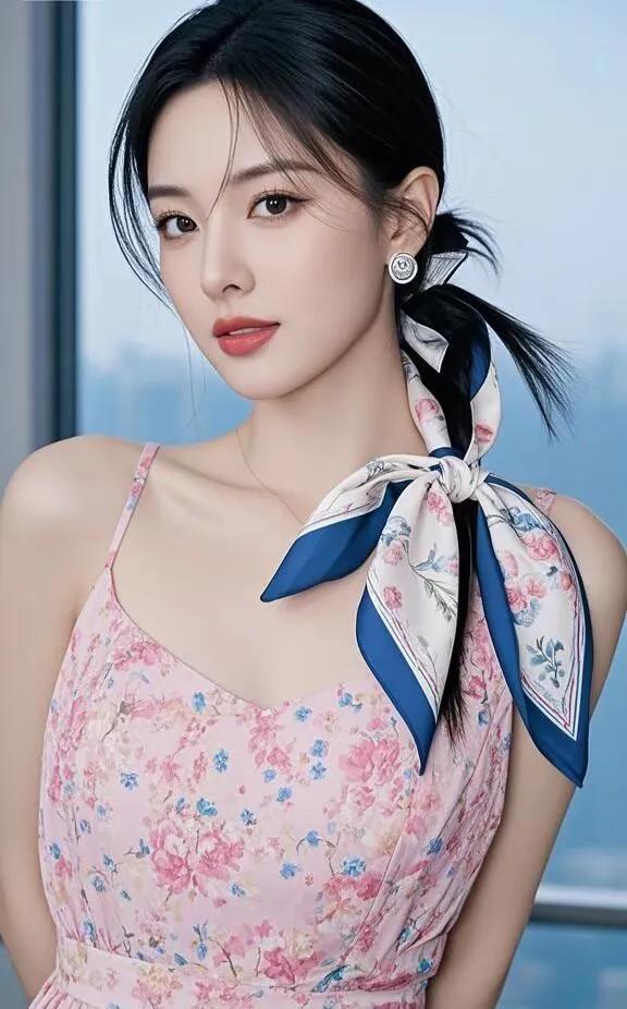 优雅少女风,粉色碎花裙搭配蓝色丝巾,甜美动人!
