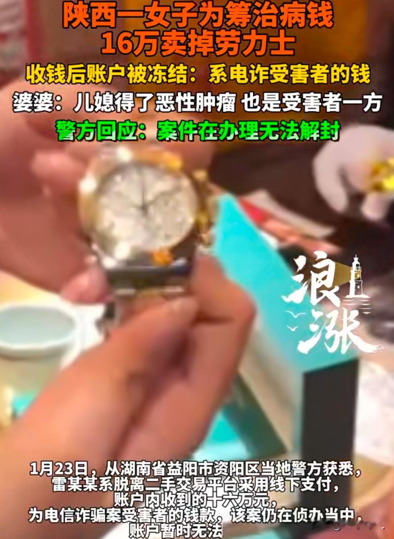 “人倒霉时喝凉水都塞牙!”陕西西安,女子为给儿媳治病,把劳力士挂在了二手平台上进行售卖。一买家以16.4的价格和女子协商好价格。谁知,对方打款时,说银行下班了,走平台不方便,要求私下转账。女子没多想,就同意了。万万想不到,第二天,女子发现账户被冻结了。原来,这笔钱是赃款。女子委屈的说:自己也是受害者!凭什么让我买单? 陈女士的儿媳雷女士十年前查出甲状腺癌,手术成功后一家人刚放下心,今年癌细胞竟转移到肺部。 治病如同烧钱,可雷女士小两口经营的烧烤店近年生意冷清,天天亏损,别说治病,糊口都成问题。 走投无路之下,一家人只好忍痛卖掉家里最值钱的劳力士手表,这压箱底的宝贝,如今成了救命的唯一指望。 10月21日,二手钟表公司的验表师上门验货。他在店里翻来覆去检查手表,核对吊牌与保修卡,看着十分专业,雷女士一家放下心来,觉得正规公司靠谱,最终谈定16.4万的价格。 到了打款环节,对方称公司对公账户已下班,个人转账更快,还出示了营业执照。 一家人满脑子都是赶紧拿到钱给雷女士交医药费,没多想便答应了。 很快,16.4万全额到账,验表师拿着表离开,雷女士看着到账短信,总算松了口气,盼着隔天就能去医院缴费。 可这口气还没松透,第二天一早意外就发生了。 雷女士买早点刷卡时,提示余额不可用,打开手机银行才发现账户被冻结! 一家人瞬间慌了神,火急火燎赶往派出所报警。查询结果如遭雷击:那16.4万竟是湖南益阳电信诈骗案的赃款,辗转多手后流入他们账户,按规定涉案资金必须冻结。 陈女士当场急哭,赶紧翻出二手平台聊天记录、店里监控、验表师验货录像等所有证据,一遍遍向益阳警方解释:“我们是正经卖表的,根本不知道是赃款,表都给出去了,我们也是受害者啊!” 警方加紧调查后发现,验表师拿表后并未回公司,而是直接打车去机场交给接头人,手表经多次转手后下落不明。 万幸的是,警方顺藤摸瓜抓获两名中间倒手人员,仍在追查手表去向。 如今的处境让这家人陷入绝境:表没了,救命钱被冻结,雷女士躺在医院,肺癌治疗一天都耽误不得,每日医药费如同大山压顶。 陈女士替儿媳与警方沟通,盼着能看在治病救人的份上先解封账户或追回手表,可警方态度坚决:“法大于情。” 警方表示,这笔钱是其他受害人的血汗钱,不能因他家有病人就违规解冻,还指出他们私下转账的过错,认为这给了犯罪分子可乘之机,其在民事上需承担责任。 警方还提出折中方案:让他们退赔16万4给诈骗案受害人,对方出具谅解书,事情可从轻处理。 这话让陈女士又气又委屈,当场拒绝:“我们也是受害者,是骗子拿赃钱骗走了表,凭什么还要我们掏钱赔偿?儿媳等着救命,我们哪还有钱退?这是正常买卖,货交了钱收了,凭什么让我们买单?” 警方称案子仍在调查,法定期限内账户将持续冻结。 《刑事诉讼法》第143条规定:冻结的存款等财产,经查明确实与案件无关的,三日内解除冻结并退还;反之,涉案资金可依法冻结。 本案中,16万4是湖南益阳电信诈骗案赃款,经多手流入雷女士账户,属于涉案资金。警方按此条冻结账户,是依法办案,这就是“法大于情”的体现。 这笔钱也是其他受害人的血汗钱,不能因雷女士治病就违规解冻。只有等案件查清,确认资金与案件无关,才能解除冻结。 《民法典》第311条这条规定,无处分权人转让动产,受让人同时满足善意(不知情无重大过失)、合理价格、动产已交付,才能取得所有权;否则,原权利人可追回财产。 雷女士一家卖表时,验表师出示营业执照、流程专业、价格合理、表已交付,看似符合部分善意取得条件。 但私下个人转账是关键瑕疵,既没有正规平台担保,也让交易风险大增,这是民事上的明显过错。而且验表师是无权处分,手表被多次转手后失踪,若追不回,雷女士一家可能面临表、钱两空,只能向验表师等相关责任人索赔。 警方冻结账户有明确法律依据,无可厚非;雷女士一家的交易过错,让他们难以完全使用善意取得保护自身权益。 这也提醒大家,贵重物品交易务必走正规平台和担保流程,避免踩坑。