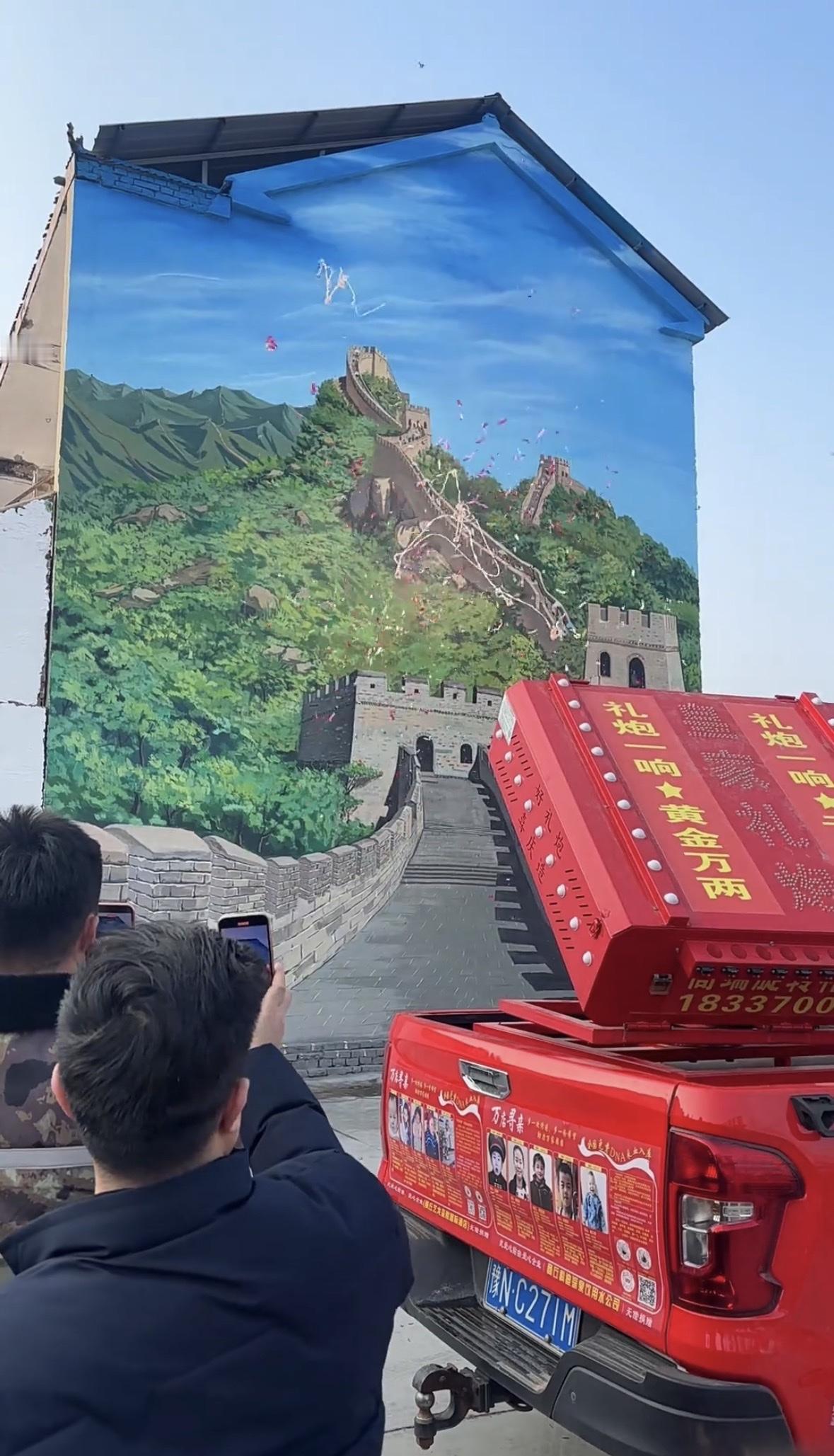吴承言长城墙绘今天竣工,长城墙绘是吴承言在吴营村的第50幅作品。 吴承言画墙绘分为四个阶段,第一阶段2023年为满足爷爷看山愿望吴承言在村里自家房后画山墙绘是开端,第二阶段2025年春节画哪吒2系列墙绘第一次带火吴营村,第三阶段同年12月画“天安门”墙绘吴营村第二次出名,吴承言开始名声大噪。 第四阶段2026年1月24日吴营村第50幅墙绘长城完成,长城墙绘竣工当天礼炮鸣响,众人在长城墙绘前合影留念。吴营村长城墙绘今天竣工 吴营村长城墙绘已完成