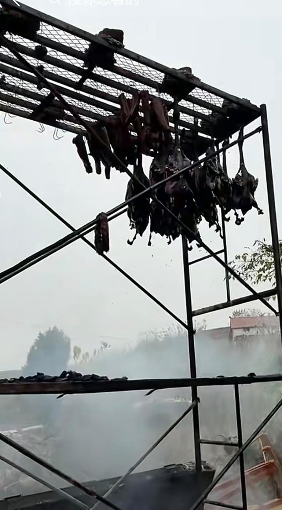 [捂脸][捂脸]小二娃熏腊肉[捂脸]熊熊大火烧起来了!腊肉全都黑了,都都烤用了。