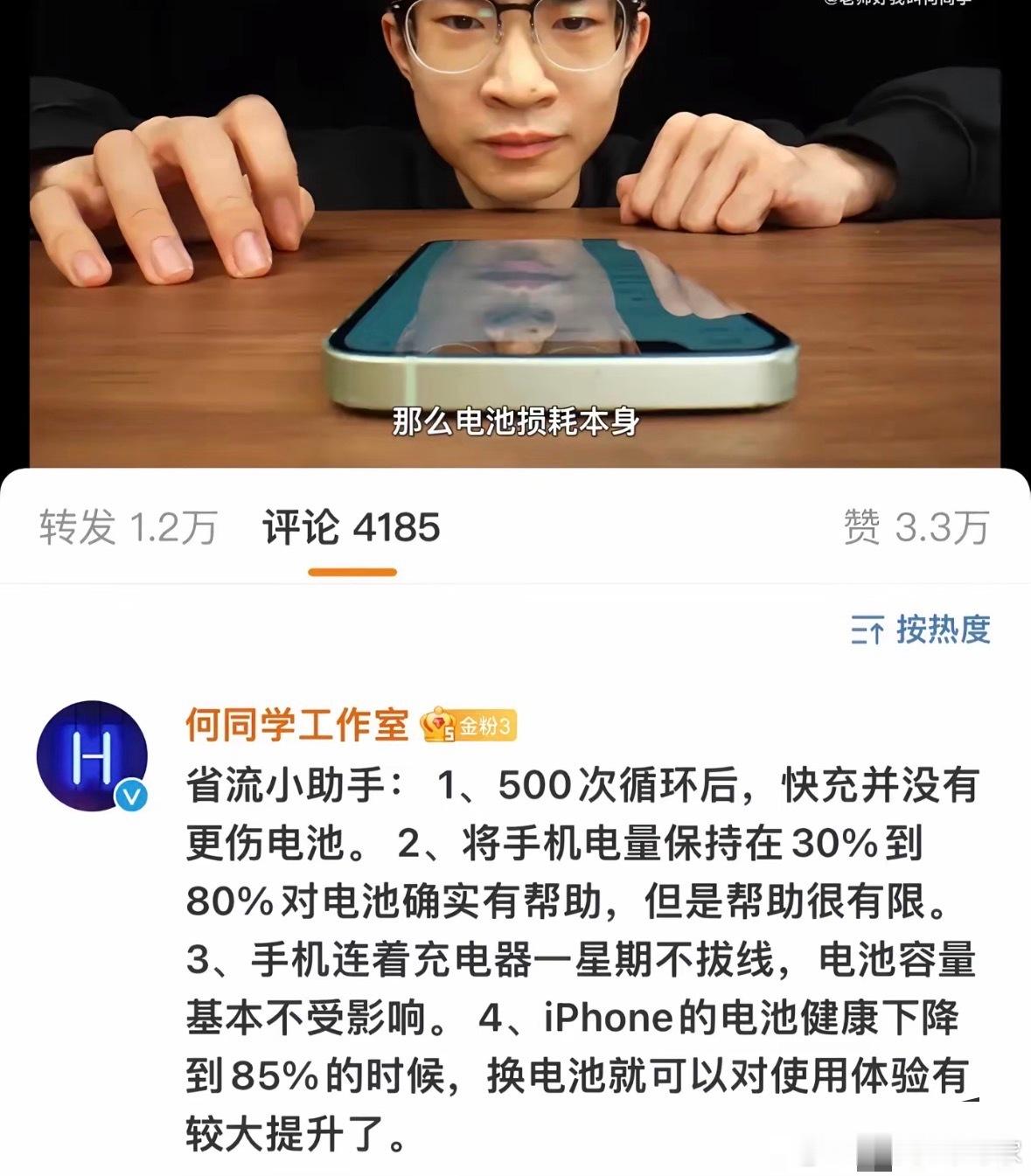 手机没电了就冲呗,买个手机还得时刻注意它什么时候充电,不累吗而且不要总说老年人爱上当了,就这个谣言传了多久了,何同学用实测也做了,快充不伤电池,20%-80%会保护电池,但是极其有限iPhone17官方电池充电建议