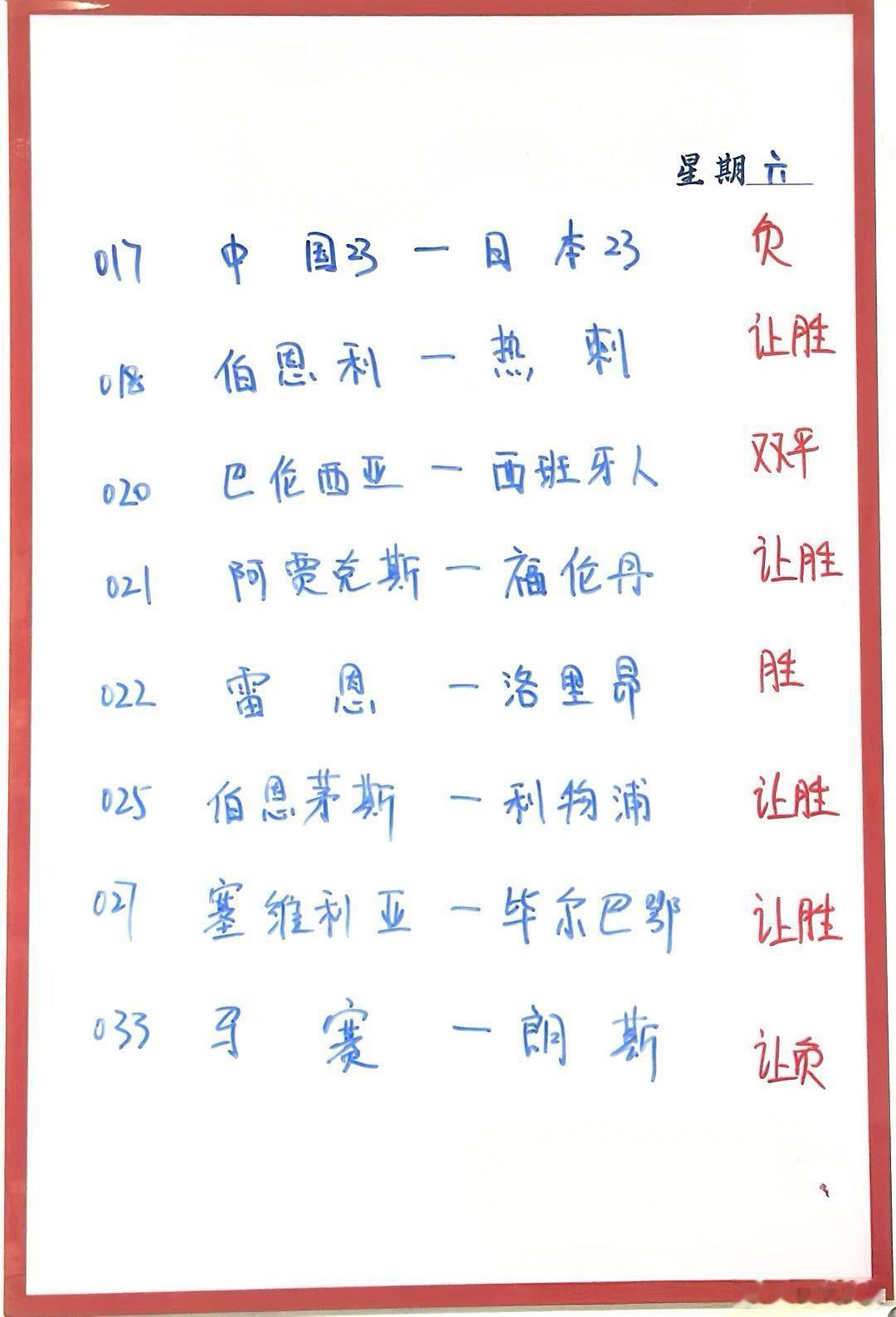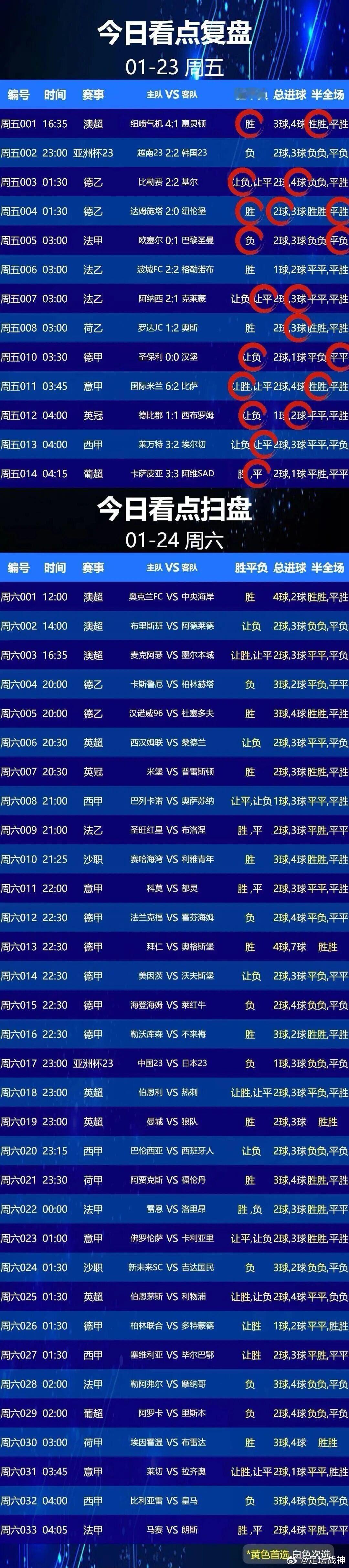 1月24日001 奥克兰FC VS 中央海岸水手002 布里斯班狮吼 VS 阿德莱德联003 麦克阿瑟 VS 墨尔本城004 卡尔斯鲁厄 VS 柏林赫塔005 汉诺威96 VS 杜塞尔多夫006 西汉姆联 VS 桑德兰007 米德尔斯堡 VS 普雷斯顿008 巴列卡诺VS 奥萨苏纳009 圣旺红星 VS 保洛尼010 赛哈特海湾 VS 利雅得青年011 科莫1907 VS 都灵012 法兰克福VS 霍芬海姆013 拜仁 VS 奥格斯堡014 美因茨 VS 沃尔夫斯堡015 海登海姆 VS 莱比锡016 勒沃库森 VS 不莱梅017 中国U23 VS 日本U23 018 伯思利 VS 热刺
