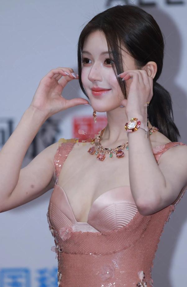 女演员赵露思在腾讯视频全明星之夜红毯上,照片中她身穿一袭粉色亮片修身礼服,点缀着花朵图案,手捧花束,凸显了她纤细的身材。