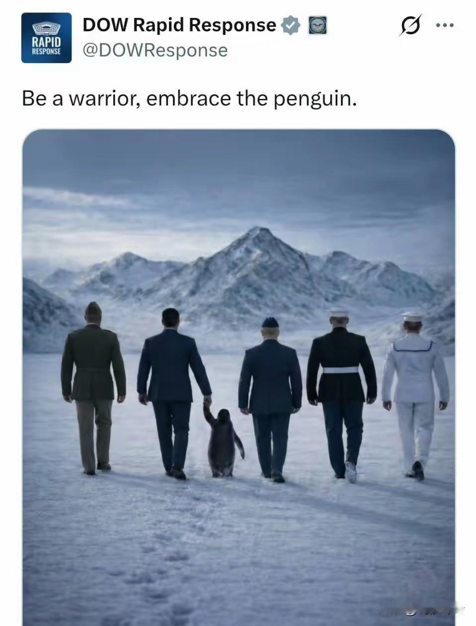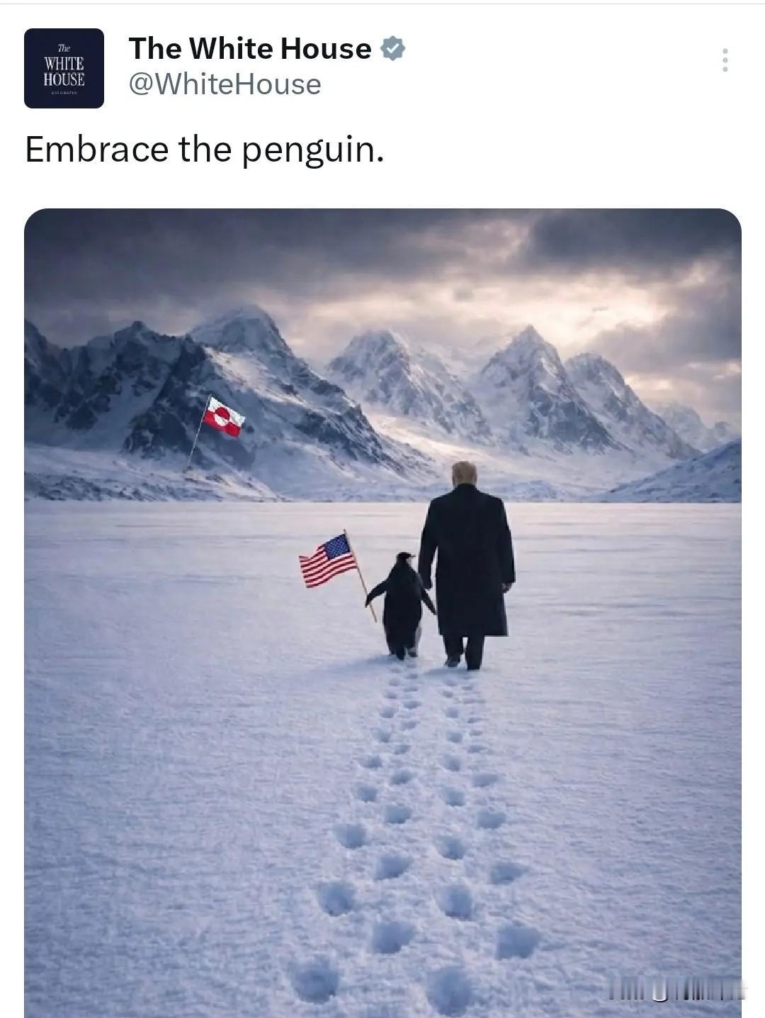 美国国防部:既然特朗普说北极有企鹅,那么我们作为战士,就应该拥抱北极企鹅——现代版指鹿为马,这恐怕是美国现状最真实的写照。 白宫按特朗普的意图,发布一张图片:特朗普牵着企鹅的手,企鹅则举着美国国旗,一起走向插着格陵兰旗帜的岛屿。 这张照片发布之后,全世界都在疯狂嘲笑特朗普,格陵兰岛在北极,北极没有企鹅,只有南极才有企鹅。 然而,就在这之后,美国国防部发布一张图片,图片背景跟特朗普那张如出一辙,图片主题是——成为战士,拥抱企鹅。