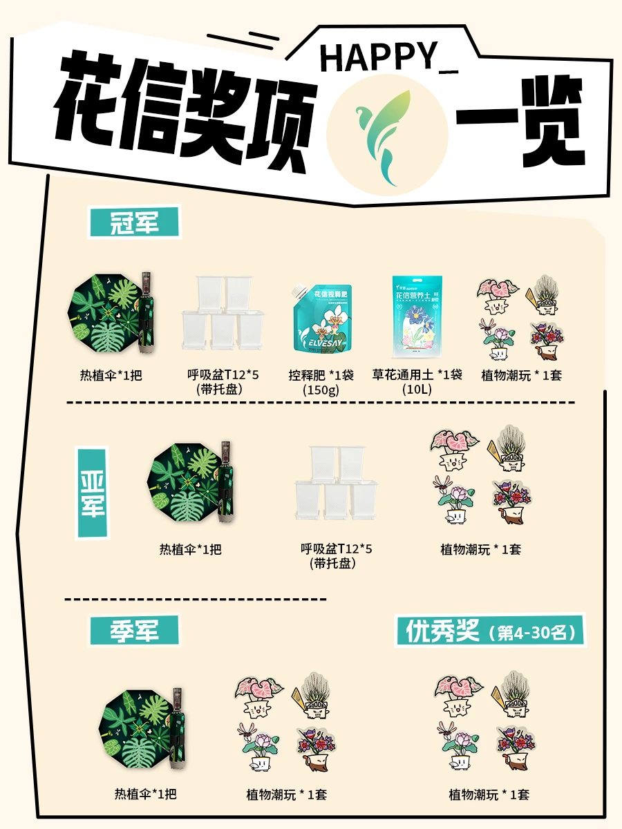 🥇第1名: 热植伞*1把+白色T12呼吸盆* 5个+150g控释肥 *1袋+10L草花营养土+植物潮玩 * 1套