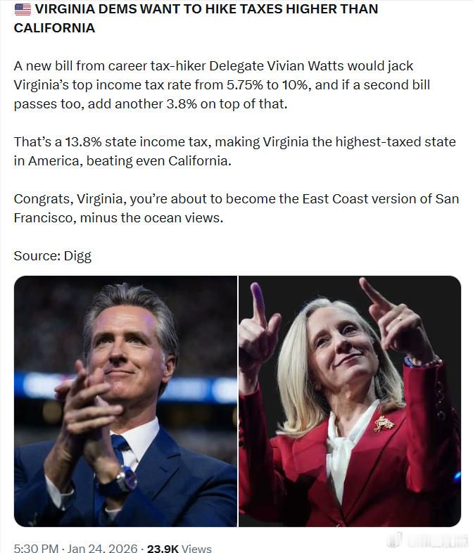 弗吉尼亚州的民左党想把税收提高到比加利福尼亚还高一项由“职业加税者”代表薇薇安·沃茨提出的新法案,拟将弗吉尼亚州的最高所得税率从5.75%提高到10%。如果另一项法案也通过,还将额外再加3.8%。这样一来,州所得税将达到13.8%,让弗吉尼亚成为美国税收最高的州,甚至超过加利福尼亚。恭喜你,弗吉尼亚,你即将成为东海岸版的旧金山——只是没有海景。