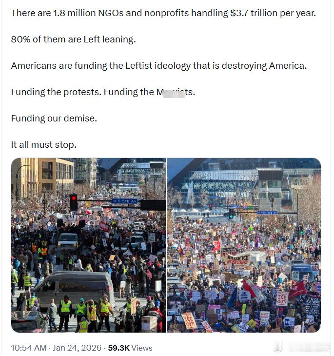 美国有180万个非政府组织(NGO)和非营利机构,每年处理3.7万亿美元资金。其中80%倾向左派。美国人正在资助正在毁掉美国的左派意识型态。资助抗议活动、资助马*思*义者、资助美国的衰落。这一切必须停止。
