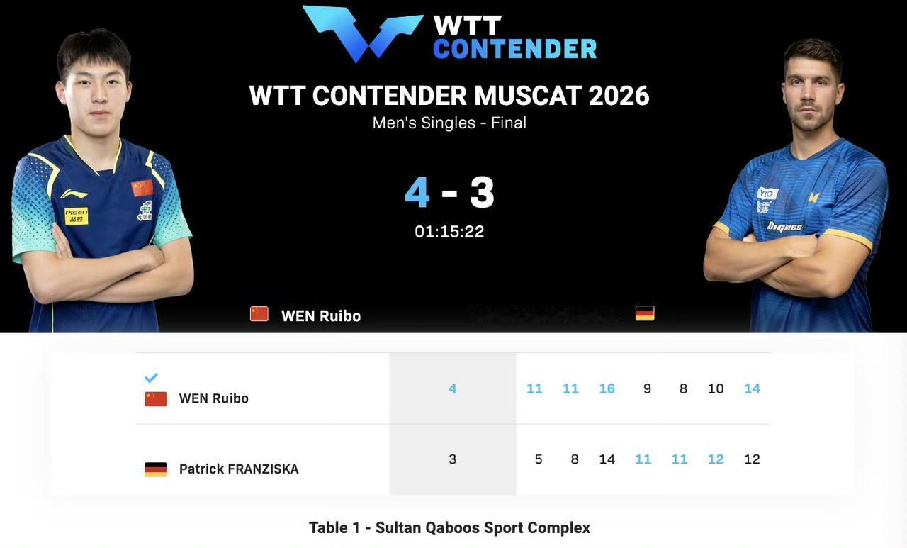 温瑞博艰难夺冠! 温瑞博3-0领先弗朗西斯卡,弗朗西斯卡连追3局,大比分来到3-3平! 这是2026年WTT常规挑战赛马斯喀特站男单决赛的比赛。温瑞博世界排名第31位,刚夺得了WTT球星挑战赛多哈站男单亚军,士气正旺!弗朗西斯卡世排第20位,德国名将,是樊振东在德国打球俱乐部的队友。 决胜局,温瑞博没有让惊天大逆转发生,以14-12拿下比赛,4-3战胜对手,夺得生涯首个WTT常规挑战赛男单冠军! 恭喜19岁的温瑞博!接下来,他继续参加WTT支线赛多哈站男单和男双的比赛。
