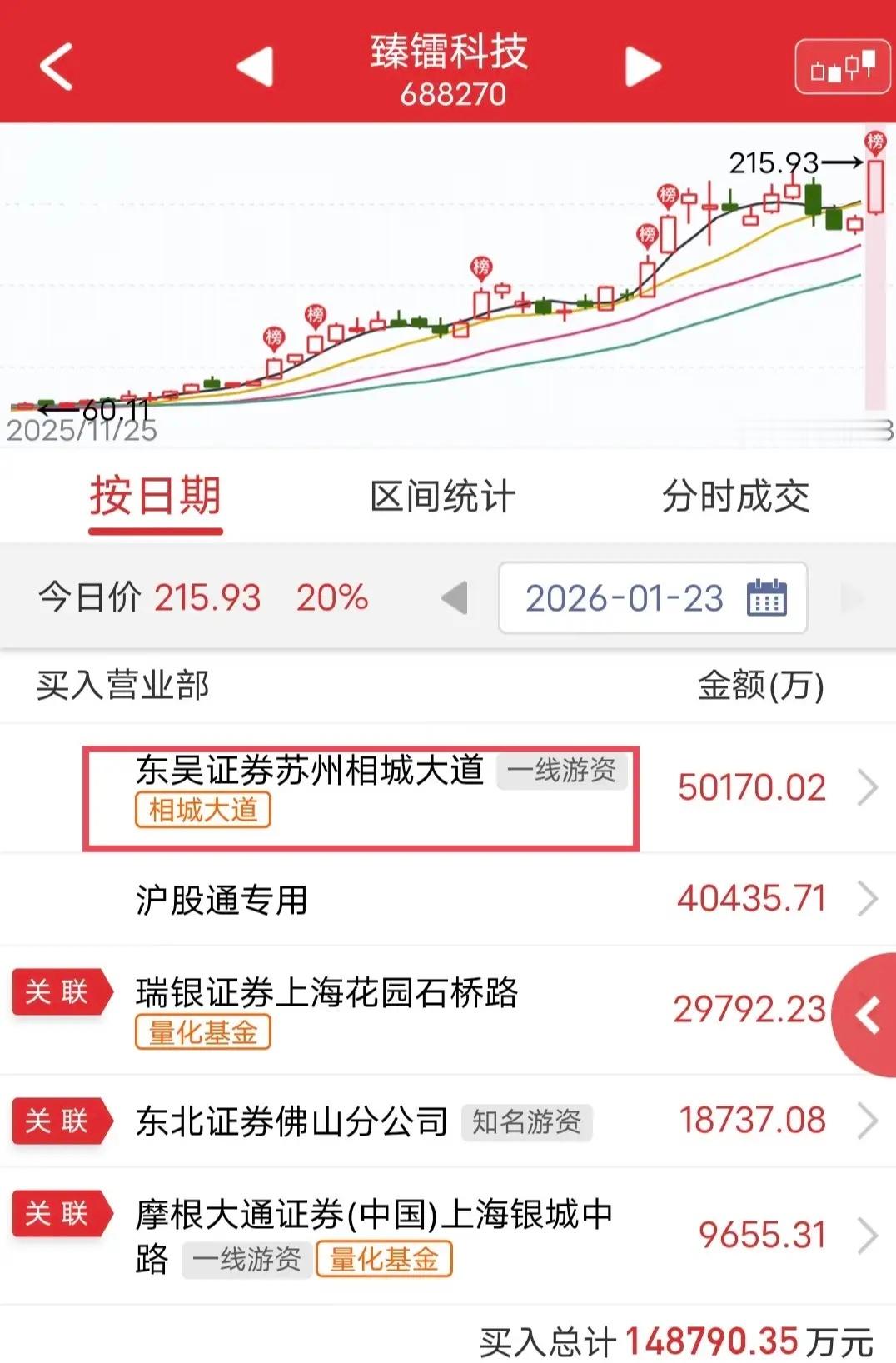 相城大道爆买5亿:周五臻镭科技涨停。盘后龙虎榜显示,相城大道爆买5亿。真是艺高人胆大啊!游资臻镭科技