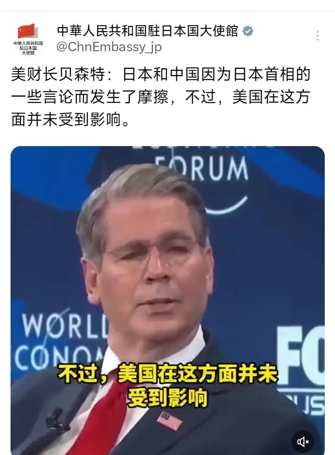 日本首相一句话,把中日美三方节奏都带偏了吗? 1月23日,中国驻日本大使馆公开了一段视频,美财长贝森特在里边说,中日因为日本首相的一些表态出现摩擦,美国“没有受影响”。 在东京,这样的说法听上去像提醒:同一句话,对北京是刺激,对华盛顿却是机会,日本在同一棋盘上承担了不同代价,而发声者却不一定是那一方。 不少观察者认为,首相更像在照顾国内政治情绪和选票,但两国之间的经贸往来、对华出口的农产品和汽车,只要出现针对性的限制措施,压力先落在企业和普通家庭身上。 有日本学者早就提醒,“历史上轻率的对外决策付出过高价”,从战前扩张到泡沫破裂,每一次判断失误,都让社会花了很长时间去修补信任和经济基础。 接下来,中日是通过沟通把话讲清、把误判压住,还是继续在言辞上加码,让摩擦从话语走向政策,这在很大程度上取决于国会讨论、企业游说和民意对风险的容忍度。 回到开头的疑问,中日关系的节奏究竟由谁来带,是情绪化表态,还是冰冷账本和现实需求,你更看重哪一个信号?