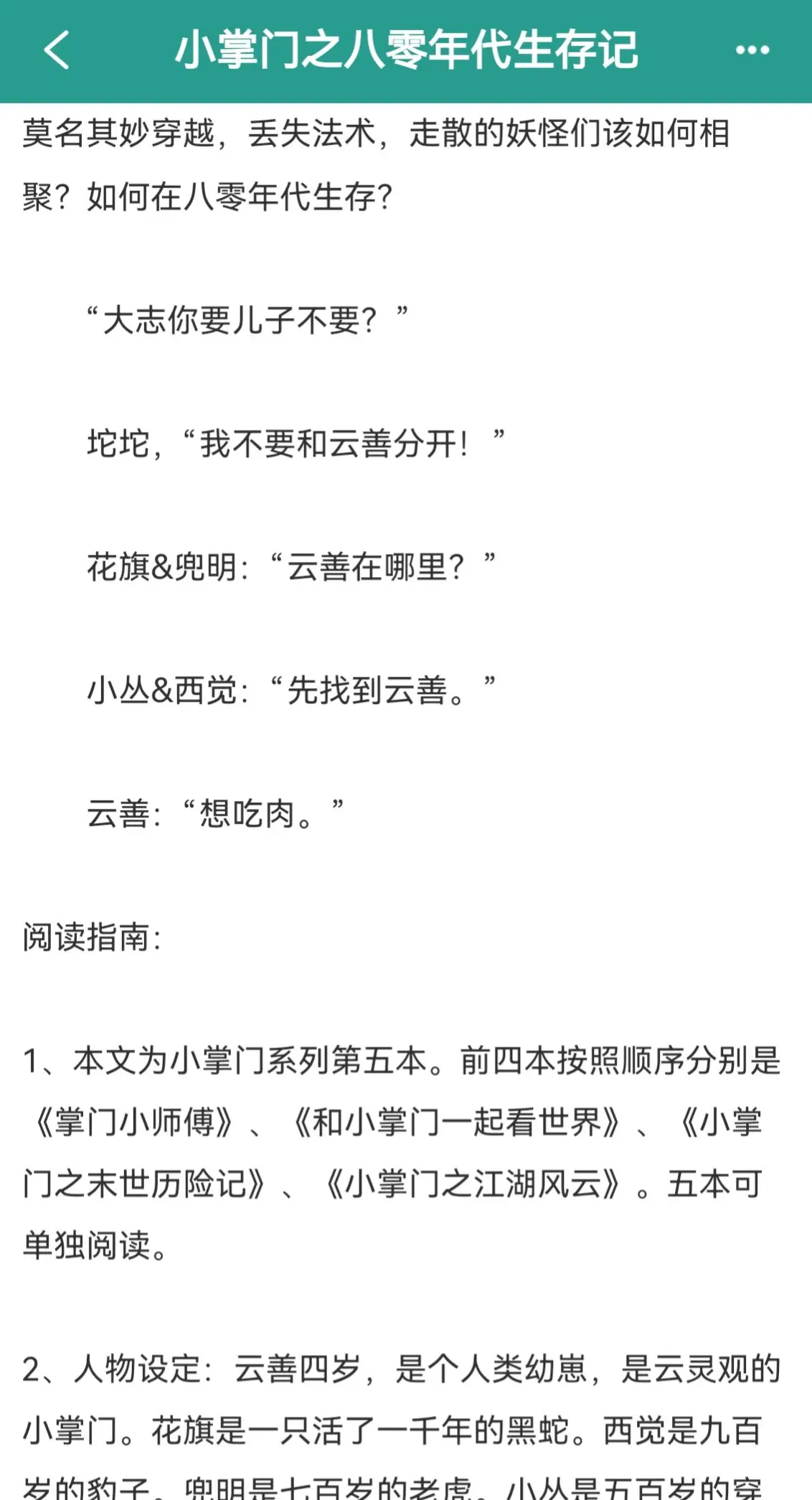 1、本文为小掌门系列第五本。前四本按照顺序分别是《掌门小师傅》、《和小掌门一起看世界》、《小掌门之末世历险记》、《小掌门之江湖风云》。五本可单独阅读。